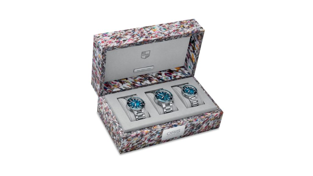 Aquis Blue Whale Limited Edition ผลิตจำนวน 200 เรือน และจำหน่ายเป็น Trilogy box set เพียง 200 ชุด เท่านั้น ประกอบด้วยนาฬิกาอีก 2 รุ่นได้แก่ Oris Clean Ocean Limited Edition และ Oris Great Barrier Reef Limited Edition III ความพิเศษนอกจากนาฬิกาแล้ว ตัวกล่องยังผลิตจากวัสดุขวดพลาสติก นำมารีไซเคิลและอัดขึ้นรูปเป็นกล่องสำหรับรุ่นนี้โดยเฉพาะ จำหน่ายในราคา 9,600 ฟรังก์สวิส