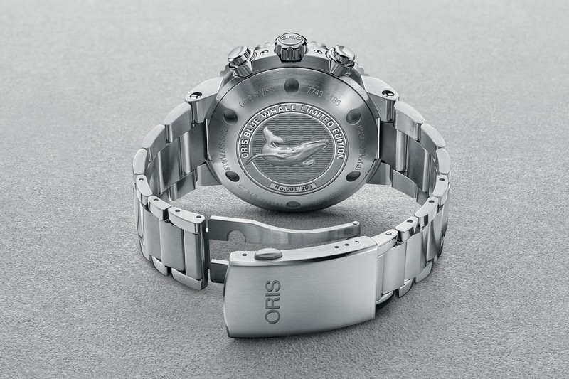 ฝาหลังสลักรูปปลาวาฬสีน้ำเงิน, คำว่า “BLUE WHALE LIMITED EDITION” และจำนวนผลิต XXX/200 ภายในตัวเรือนบรรจุกลไก automatic chronograph Oris 771 (base Sellita SW510) ความถี่ 4Hz (28,800vph) สำรองพลังงาน 48 ชั่วโมง กันน้ำ 500 เมตร