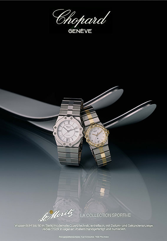 จนถึงยุค 1980s Chopard มีนาฬิกาแนวนี้ในอดีตคือรุ่น “St.Moritz” โดยมีเอกลักษณ์เฉพาะตัวโดยใช้สกรูยึดขอบหน้าปัดและฝาหลังเข้ากับตัวเรือน ใช้สายโลหะที่ออกแบบให้เข้ากับตัวเรือนแบบ Integreated Bracelet