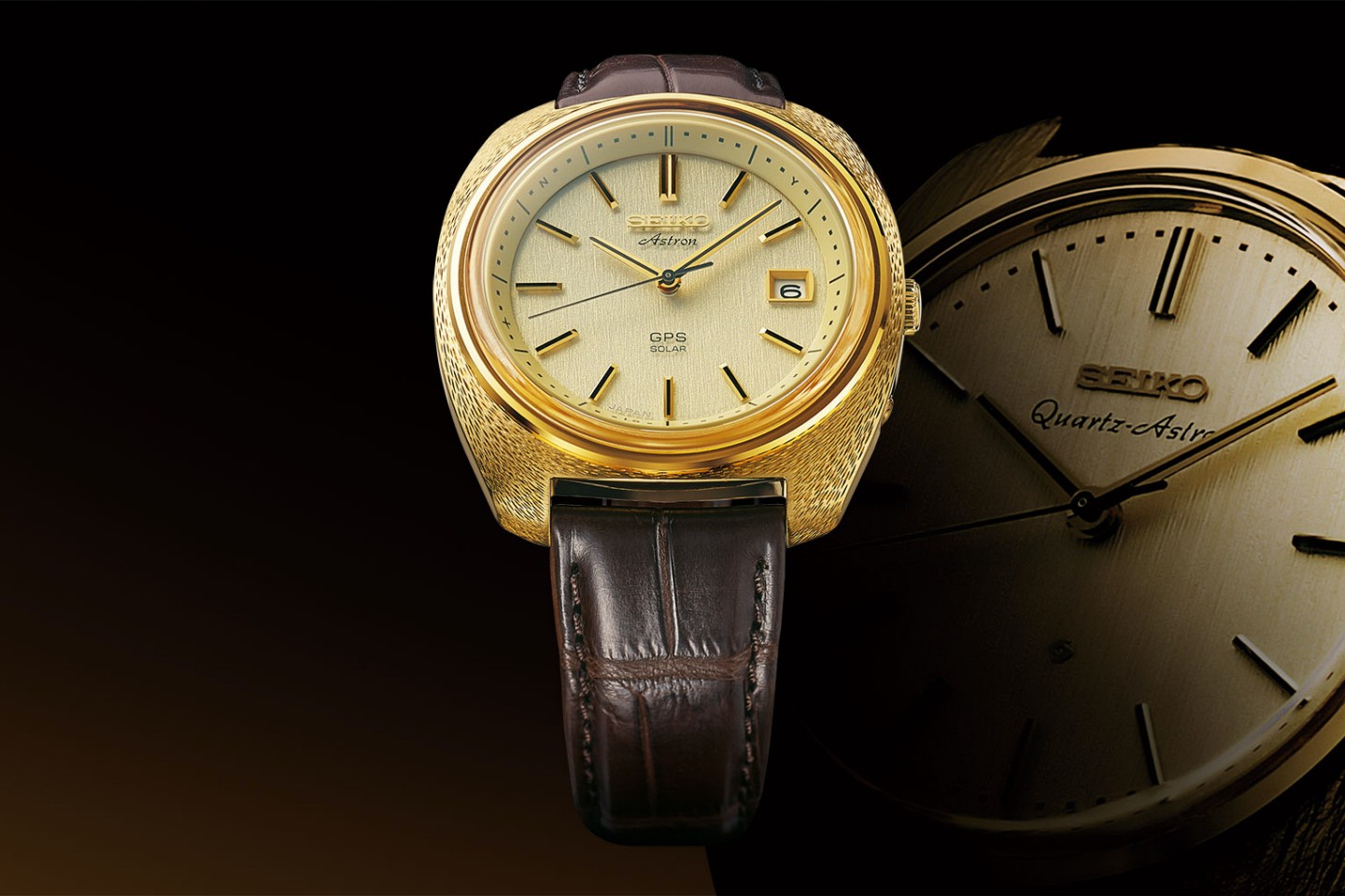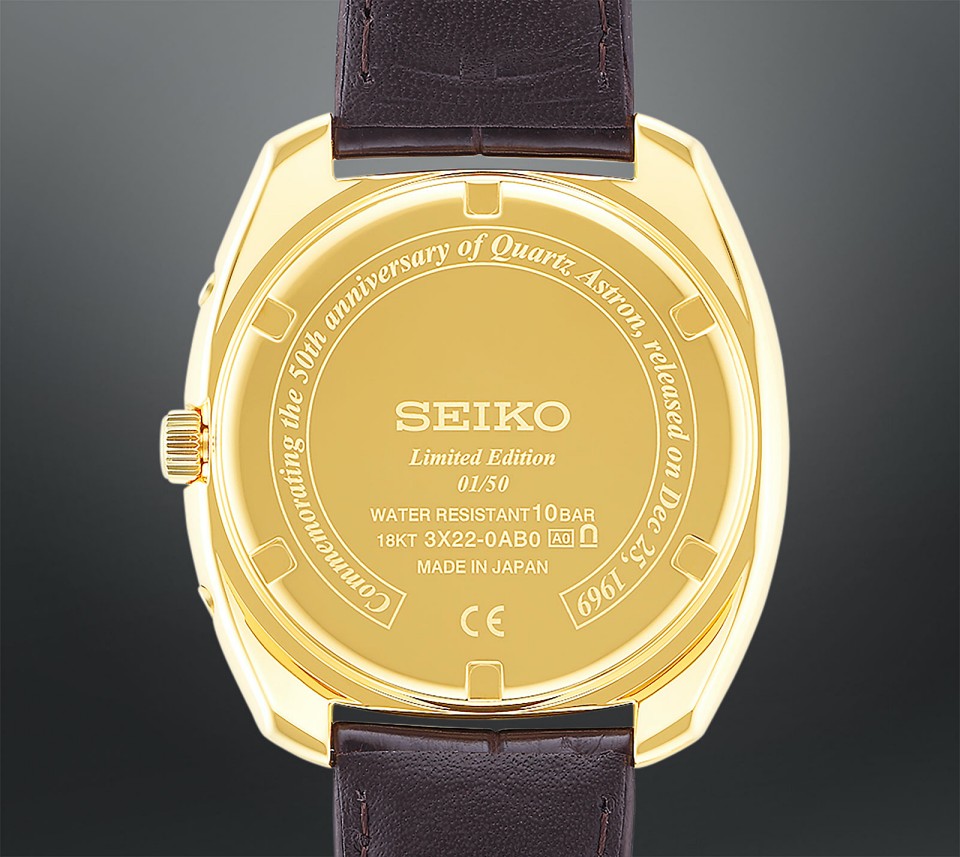 SEIKO ฉลองครบรอบ 50 ปี ‘Astron’ ด้วยการเปิดตัวนาฬิการุ่นพิเศษแบบ Re-Edition โดยการนำรายละเอียดมาจากรุ่น Original ปี 1969 เริ่มจากตัวเรือนทรงสี่เหลี่ยมหน้าปัดกลมผลิตจากทองคำ 18 กะรัต ขนาด 40.9 มิลลิเมตร หนา 12.8 มิลลิเมตร มีการขัดแต่งตัวเรือนและหน้าปัดสีทองเป็นลายผ้า มีแผงโซล่ารับแสงใต้แผ่นหน้าปัดเพื่อนำไปเป็นพลังงานขับเคลื่อนกลไก มาร์กเกอร์แบบขีดและเข็มมีแถบสีดำ หน้าต่างวันที่ตรงตำแหน่ง 3 นาฬิกา ใช้กระจกหน้าปัดแซฟไฟร์แบบโดมเคลือบตัดแสงด้านใน มาพร้อมสายหนังจระเข้สีน้ำตาลและโฟลดิ้งบัคเคิลทองคำ 18 กะรัตแบบ 3 ชั้น
