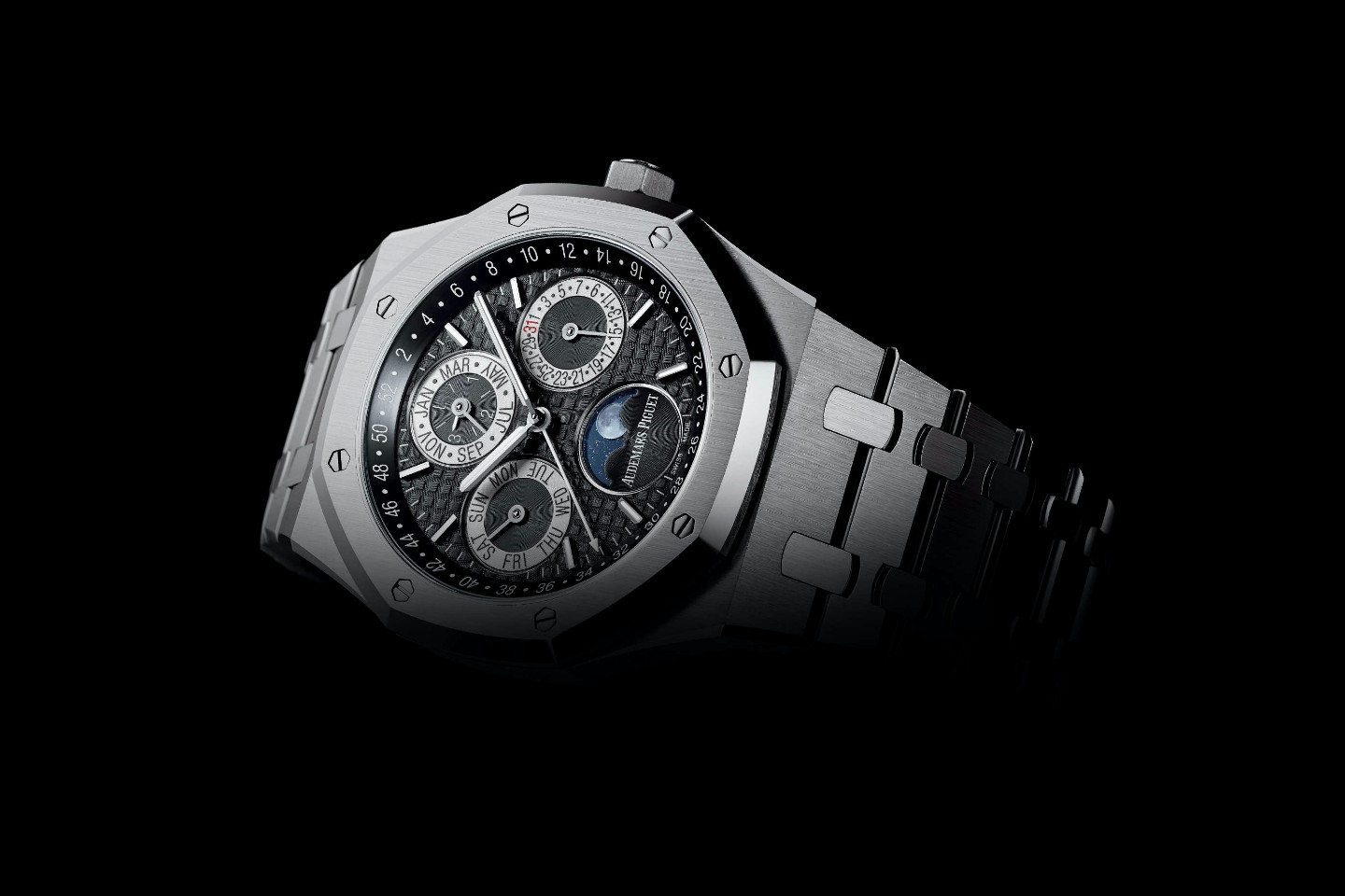 มาถึงนาฬิการุ่นพิเศษของคอลเลคชั่นนี้อีกครั้ง ด้วยการเปิดตัวนาฬิกา Audemars Piguet Royal Oak Perpetual Calendar ในตัวเรือนและสาย Platinum 950 ขนาด 41 มิลลิเมตร หนา 9.5 มิลลิเมตร กระจกหน้าปัดและฝาหลังแซฟไฟร์ กันน้ำลึก 20 เมตร