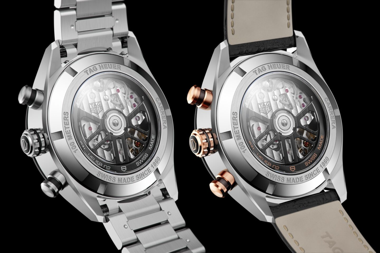 นาฬิกาทั้ง 4 รุ่น ใช้ฝาหลังขันเกลียวแบบโปร่งใส โชว์การทำงานของกลไก Automatic Chronograph Cal.Heuer 02 ความถี่ 28,800 ครั้ง/ชั่วโมง สำรองพลังงาน 80 ชั่วโมง มาพร้อมฟังก์ชั่นจับเวลาต่อเนื่องสูงสุด 12 ชั่วโมง ที่ควบคุมด้วยกลไก Column Wheel และ Virtical Clutch แท่นเครื่องและสะพานจักรถูกขัดแต่งอย่างสวยงาม ใช้ Rotor วงกลมฉลุเป็นซี่เคลือบสีดำเหมือนลายล้อรถแข่งให้อารมณ์สปอร์ต