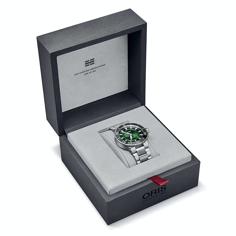 นาฬิกามาพร้อมกล่องสีเทาที่ออกแบบเป็นพิเศษสำหรับรุ่นนี้โดยเฉพาะ โดยระบุชื่อรุ่น “Oris Hangang Limited Edition One of 2,000”