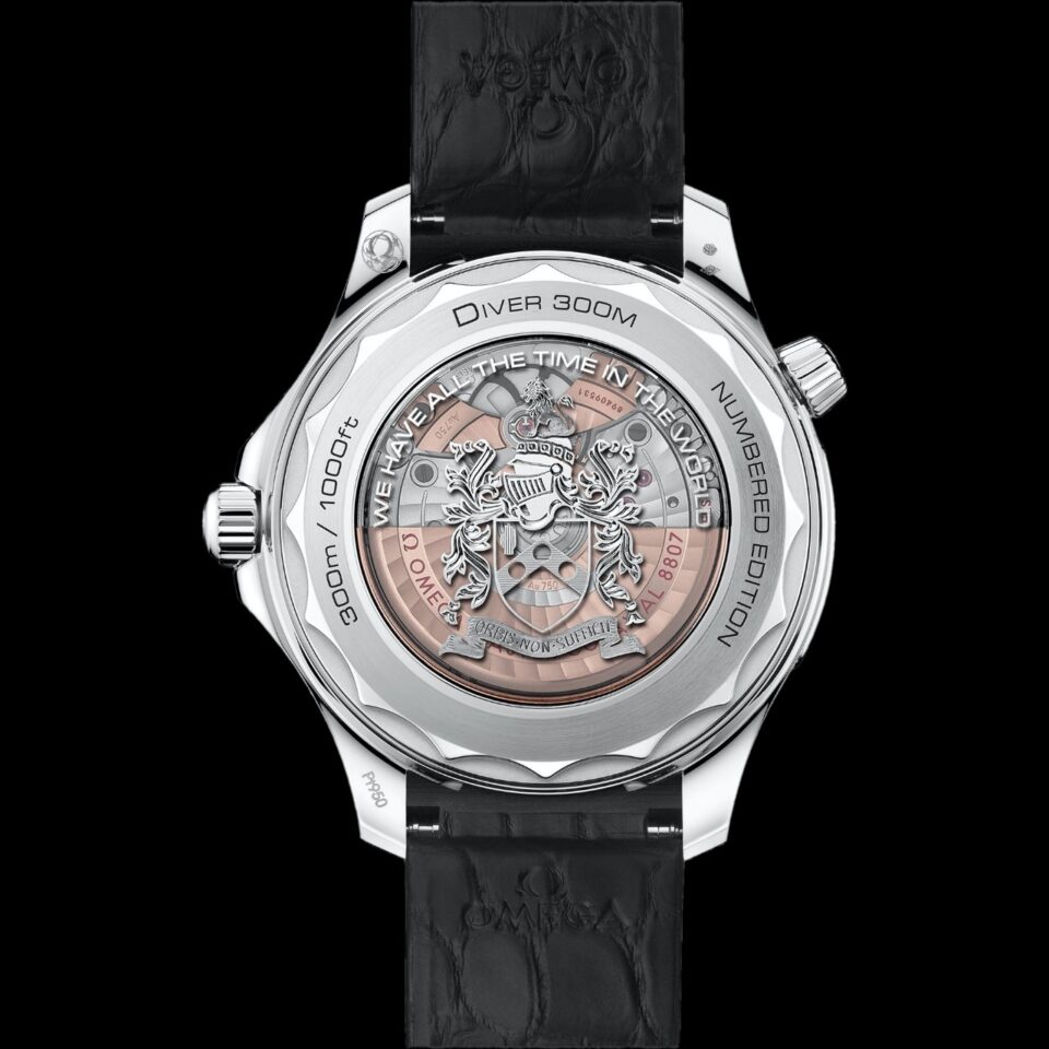 ฝาหลังแบบขันเกลียวผนึกแน่นด้วยกระจก Sapphire ที่มีการพิมพ์โลโก้ “Bond family coat-of-arm” สีเงิน โชว์การทำงานของกลไก Automatic Co-Axial Cal.8807 ความถี่ 25,500 ครั้ง/ชั่วโมง สำรองพลังงาน 55 ชั่วโมง ผ่านการทดสอบความเที่ยงตรงในระดับ Master Chronometer จากสถาบัน METAS และขัดแต่งอย่างสวยงามโดยใช้ Balance Bridge และ Rotor Sedna Gold 18K