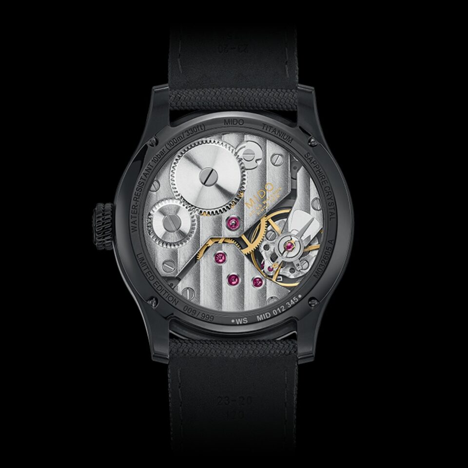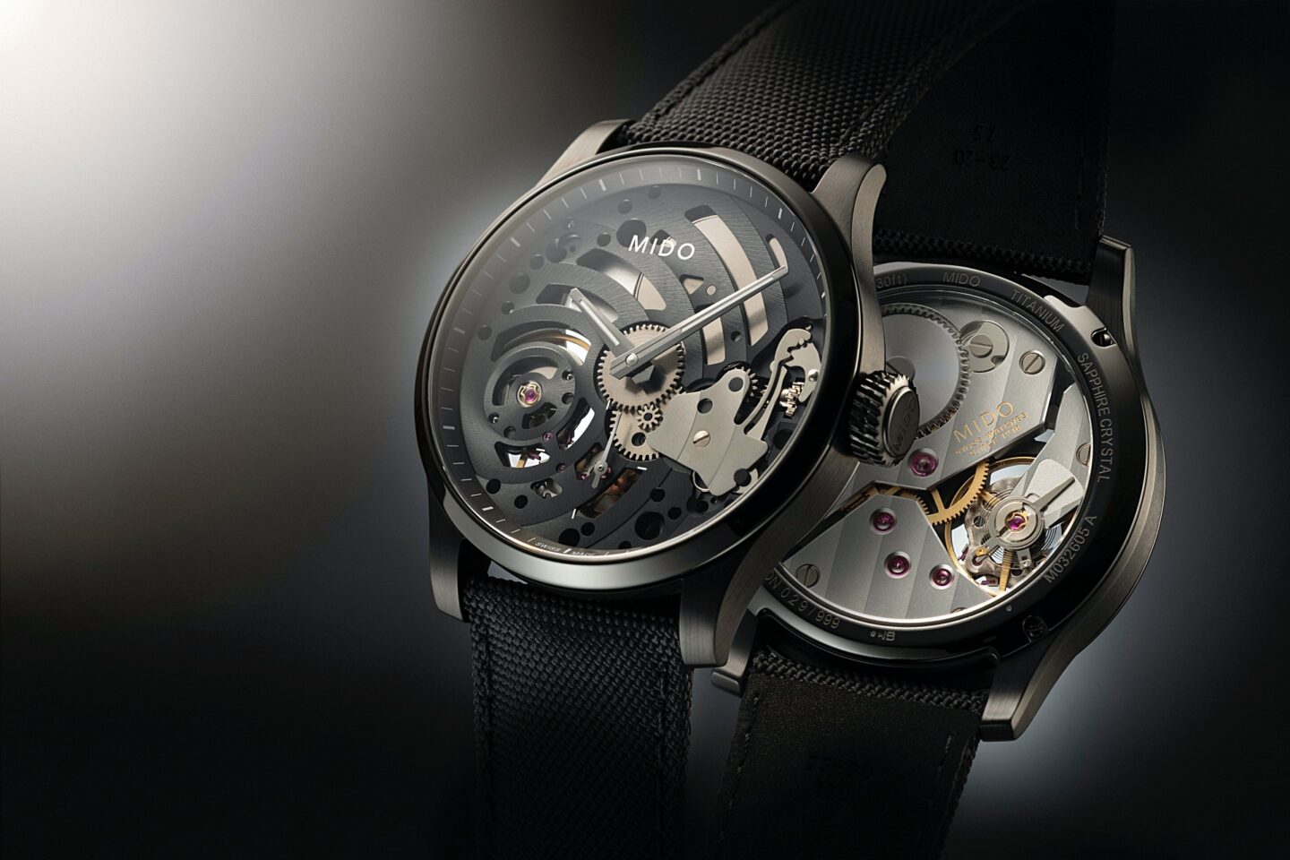 หน้าปัด Skeleton ฉลุจากแท่นเครื่องที่ขัดแต่งลวดลาย Geneva Stripe และเคลือบสีดำ โดยสามารถมองเห็นทะลุไปถึงด้านหลังของกลไก เข็มบอกเวลาเคลือบสีดำและหยอดสารเรืองแสง Super Luminova มีหลักขีดชั่วโมงและนาทีรอบหน้าปัดด้านใน และมีการพิมพ์โลโก้ MIDO บนกระจกหน้าปัด Sapphire ตัวเรือน Titanium เคลือบ PVD สีดำ ขนาด 44 มิลลิเมตร หนา 11.98 มิลลิเมตร มีการขัดแต่งแบบเงาที่ขอบหน้าปัดและลวดลายซาตินที่ด้านข้างตัวเรือน เม็ดมะยมขนาดใหญ่เซาะรองกันลื่น
