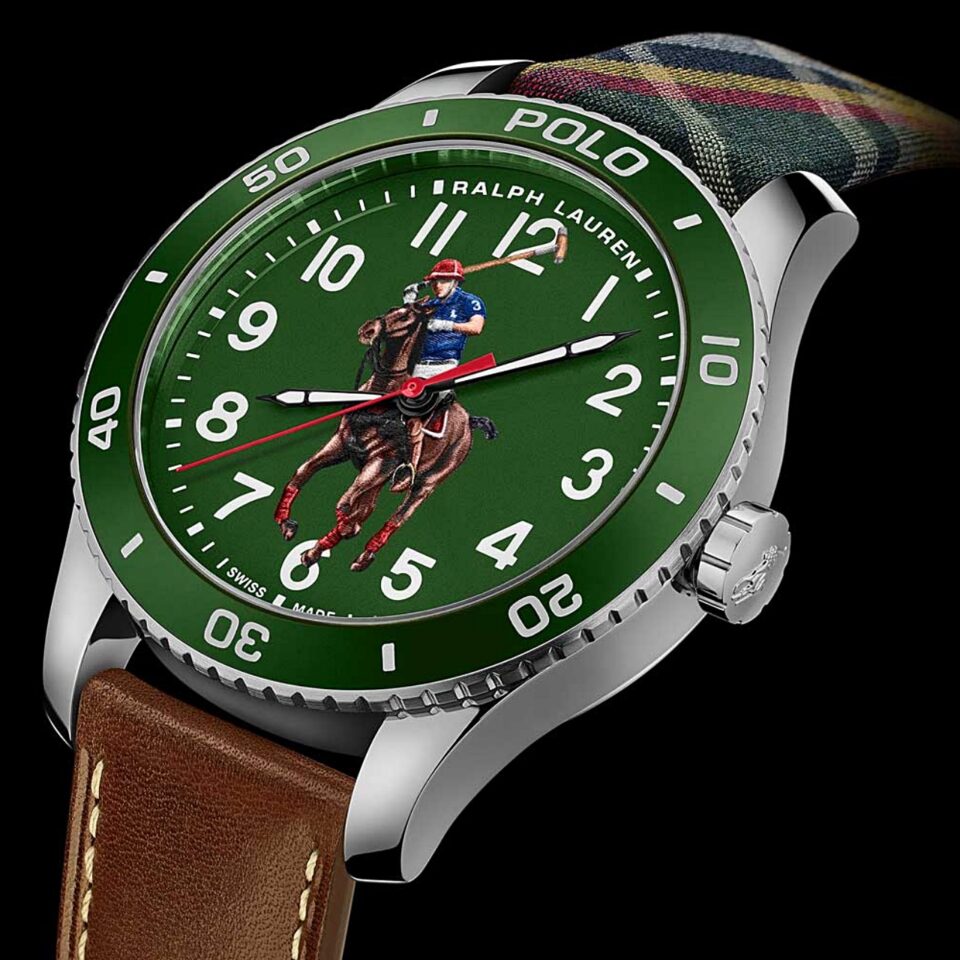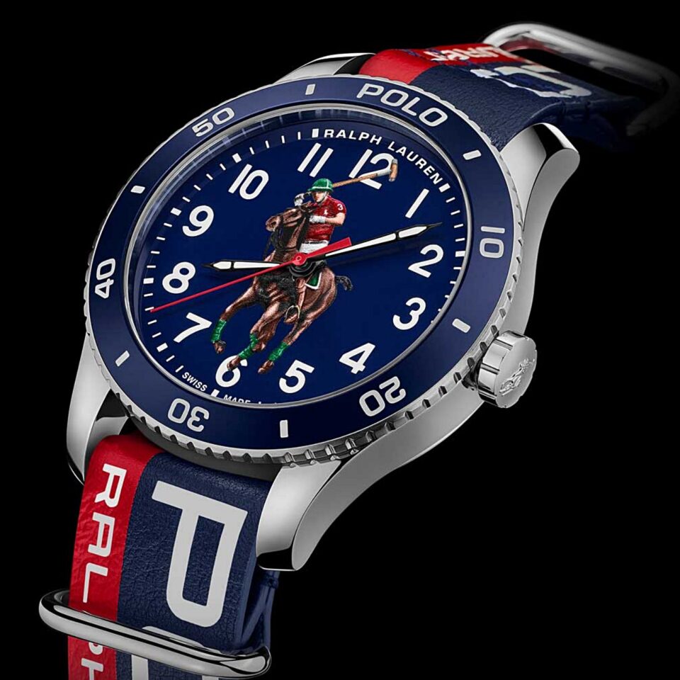 ปีนี้ Ralph Lauren บุกตลาดนาฬิกาแฟชั่นไฮเอนด์อีกครั้ง ด้วยการเปิดตัวนาฬิกาสปอร์ตที่ใส่ความเป็นตัวตนของแบรนด์ลวดลาย “Pony” หรือรูปคนเล่นโปโลบนหลังม้า ซึ่งเป็นโลโก้ของแบรนด์ “Polo” มายาวนานหลายสิบปีไว้บนหน้าปัด ร่วมกับหลักชั่วโมงตัวเลขอารบิกและชุดเข็มทรงดาบเคลือบสารเรืองแสง Super Luminova และใช้กระจกหน้าปัด Sapphire