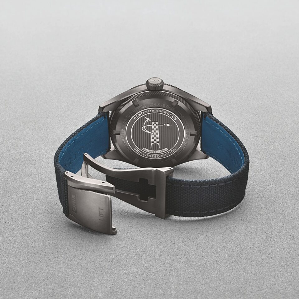ฝาหลังแบบปิดทึบขันเกลียวกันน้ำลึก 100 เมตร สลักข้อความ “Reno 57th Air Races” และโลโก้การแข่งขันกับหมายเลขประจำเรือน XXXX/1000 ภายในขับเคลื่อนด้วยกลไก Automatic Oris 798 (Base Sellita SW330-1) ความถี่ 28,800 ครั้ง/ชั่วโมง สำรองพลังงาน 42 ชั่วโมง