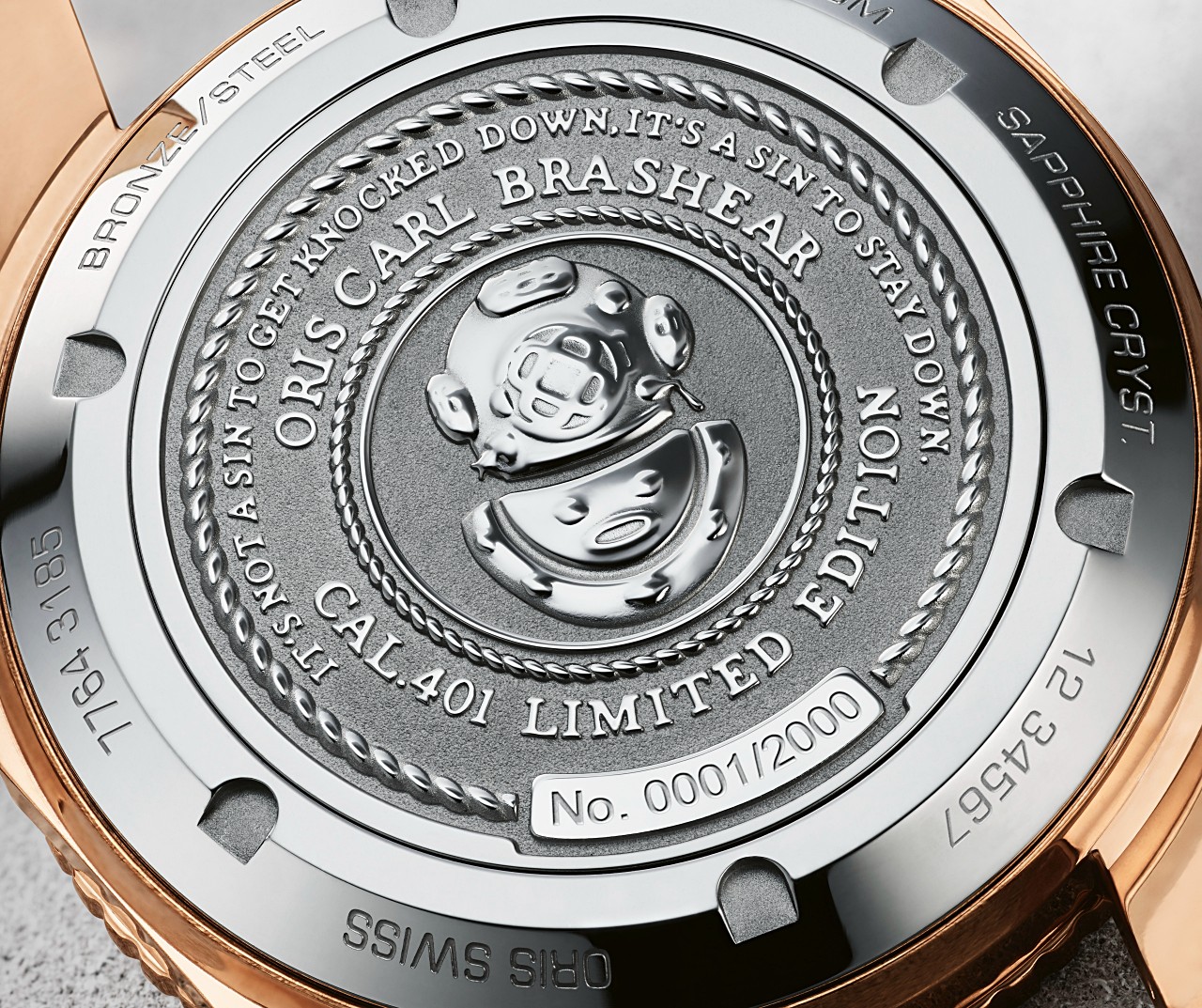ฝาหลังแบบขันเกลียวผลิตจาก Stainless Steel สลักรูปหมวกนักประดาน้ำโบราณ และข้อความ “It’s not a sin to get knocked down, it’s a sin to stay down” วลีที่สร้างกำลังใจอันยิ่งใหญ่ของ Carl Brashear และหมายเลขประจำเรือน โดยภายในขับเคลื่อนด้วยกลไก Automatic In-House Cal.401 (Base Cal.400) ความถี่ 28,800 ครั้ง/ชั่วโมง สำรองพลังงานสูงสุด 120 ชั่วโมง หรือ 5 วัน ที่ผ่านการทดสอบความเที่ยงตรงระดับ Chronometer และรับประกันคุณภาพจากการผลิต 10 ปี