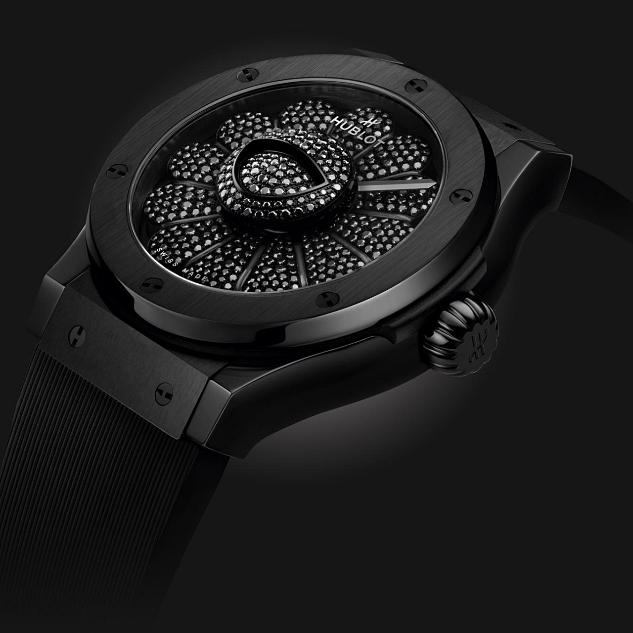 นาฬิการุ่นพิเศษเรือนนี้ มีความโดดเด่นอยู่ที่หน้าปัดสีดำคลือบ Lacquered บอกเวลาด้วยชุดเข็มชั่วโมง-นาทีเคลือบสีดำ หลักชั่วโมงรูปดอกไม้ ‘Smiling Flower’ 12 กลีบ ที่สามารถเคลื่อนไหวได้ โดยทั้งหมดประดับด้วย Black Diamond 456 ชิ้น และรอยยิ้มตรงกลางหน้าปัด 107 ชิ้น ซึ่งถูกตีความใหม่ด้วยการใช้สีดำทั้งหมดแต่ยังคงความน่ารักเอาไว้แม้จะไม่ได้ใช้สีสันสดใสตามสไตล์