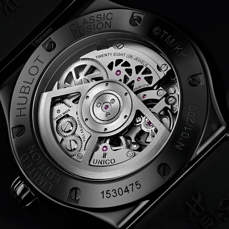 ฝาหลัง Ceramic สีดำ สลักหมายเลขประจำเรือน XXX/200 และตัวอักษร ©TM/KK ผนึกด้วยกระจก Sapphire โชว์การทำงานของกลไก Automatic In-House Cal.MHUB1214 UNICO ความถี่ 28,800 ครั้ง/ชั่วโมง สำรองพลังงาน 72 ชั่วโมง ใช้ Silicon Escapement และขัดแต่งกลไกด้วยเทคนิค Sandblast