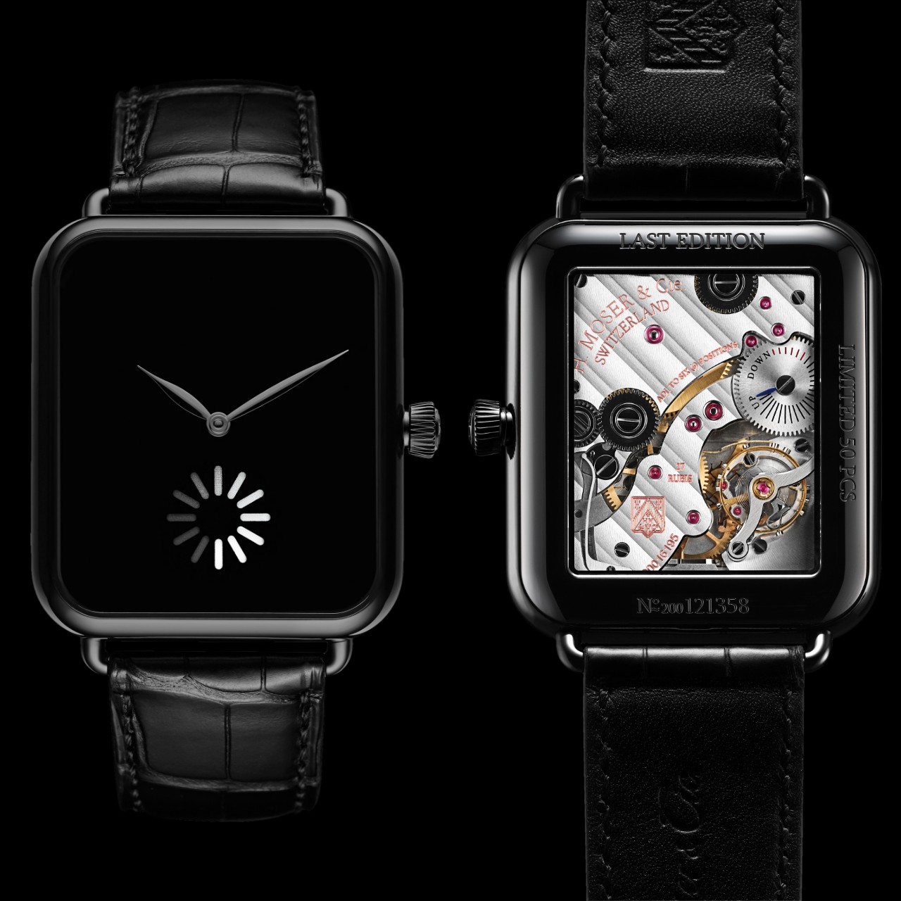 ตัวเรือน Stainless Steel ทรงสี่เหลี่ยมเคลือบ DLC สีดำ ขนาด 38.2 x 44 มิลลิเมตร หนา 10.5 มิลลิเมตร ใช้กระจกหน้าปัด Sapphire ฝาหลังสลักคำว่า ‘Limited 50 pcs’ ภายในขับเคลื่อนด้วยกลไกไขลาน In-House Cal.HMC 324 ความถี่ 18,000 ครั้ง/ชั่วโมง สำรองพลังงาน 96 ชั่วโมง หรือ 4 วัน ผ่านการขัดแต่งอย่างประณีตงดงามด้วยลวดลาย Moser Double Stripe และมีสเกลบอกพลังงานสำรอง โดยมาพร้อมสายหนังจระเข้สีดำกับ Pin Buckle Steel เคลือบ DLC สีดำ