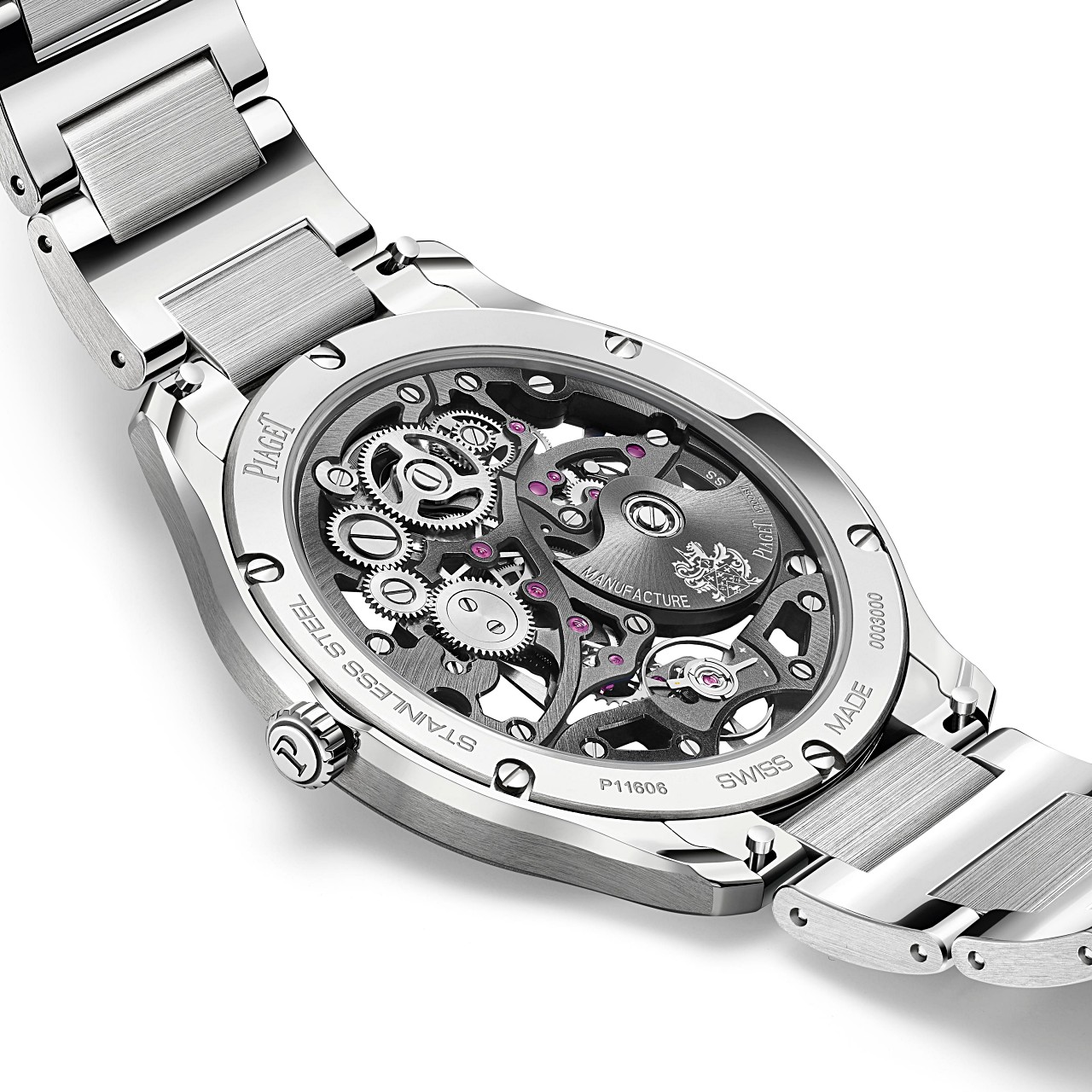 ฝาหลังแบบโปร่งใสโชว์กลไก Automatic In-House Cal.1200S1 ความถี่ 28,800 ครั้ง/ชั่วโมง สำรองพลังงาน 44 ชั่วโมง ที่มีสีสันเดียวกับแท่นเครื่องด้านหน้า และใช้ Micro Rotor สลักรูป Manufacture Piaget Hallmark