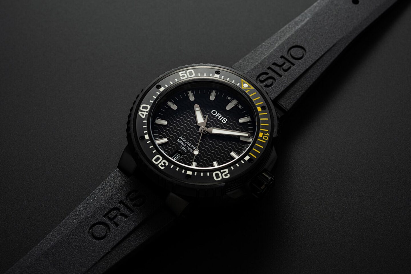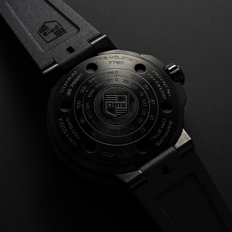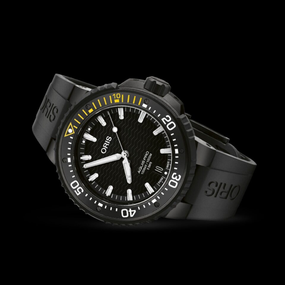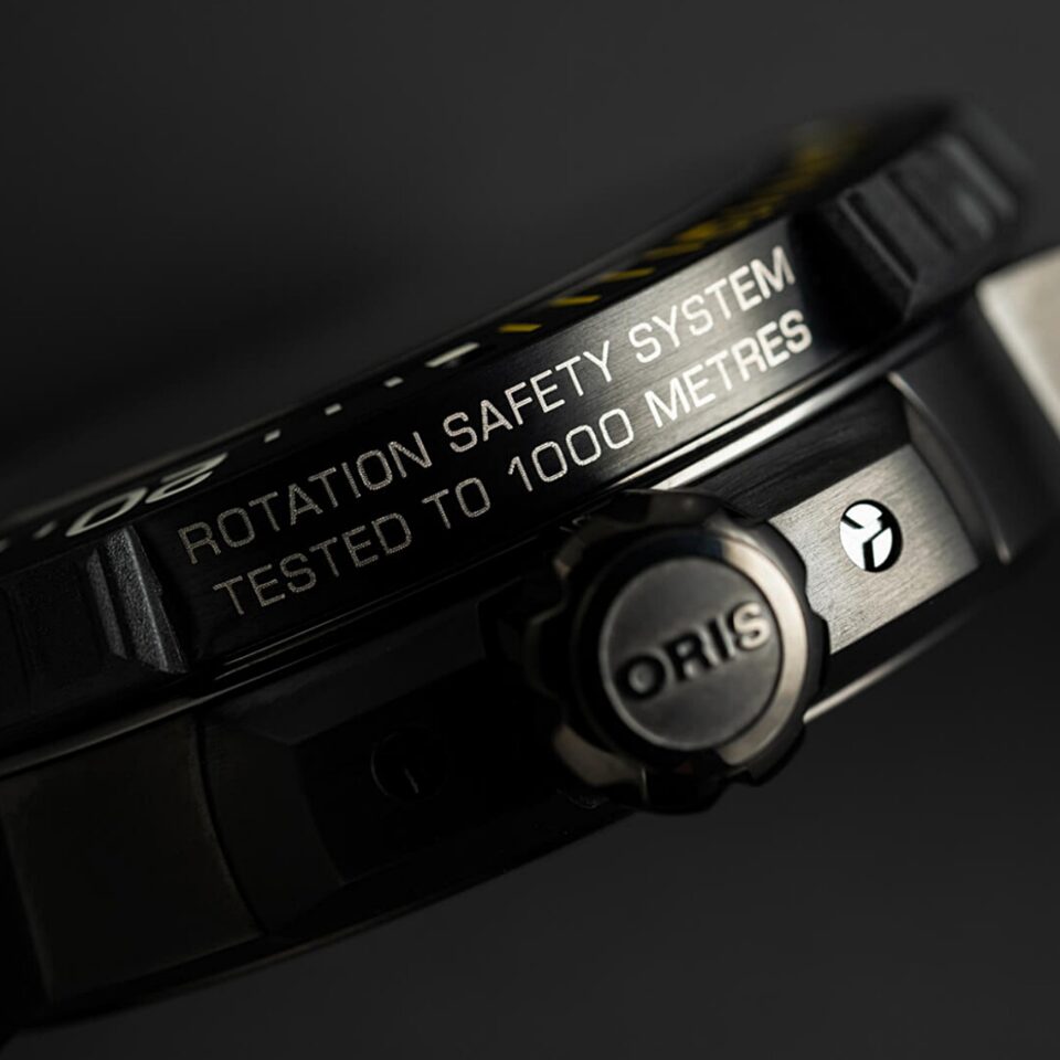 จนมาถึงปีนี้ Oris เปิดตัวนาฬิกาดำน้ำที่รองรับการใช้งานในระดับมืออาชีพ ด้วยตัวเรือน Titanium เคลือบสีดำ ขนาด 49.5 มิลลิเมตร ที่สร้างขึ้นจากโครงสร้างทางวิศวกรรมสุดซับซ้อนอย่างระบบ RSS (Rotation Safety System) ช่วยให้การหมุนและล็อกขอบหน้าปัดที่หมุนได้ทิศทางเดียวเป็นไปอย่างปลอดภัย โดยทำงานร่วมกับขอบ Bezel กับ Insert Ceramic สลักสี Diving Scale สีเหลือง-ขาว ที่สามารถมองเห็นได้ชัดเจนทุกสภาพแสงในขณะดำน้ำลึก ซึ่งเป็นสิ่งสำคัญสำหรับนักดำน้ำระดับมืออาชีพ