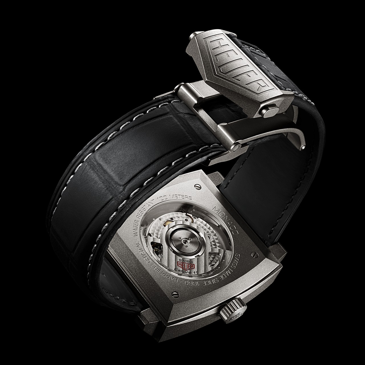 ฝาหลังแบบโปร่งใส ยึดด้วยสกรู 4 ตัว กันน้ำลึก 100 เมตร ภายในขับเคลื่อนด้วยกลไก Automatic Chronograph Cal.11 (Base Sellita SW-200 300 + Dubois-Depraz Chronograph Module) ความถี่ 28,800 ครั้ง/ชั่วโมง สำรองพลังงาน 40 ชั่วโมง พร้อมฟังก์ชั่นจับเวลาต่อเนื่องสูงสุด 30 นาที นาฬิกามาพร้อมสายหนังจระเข้สีดำเย็บด้ายสีขาวกับ Folding Buckle Titanium