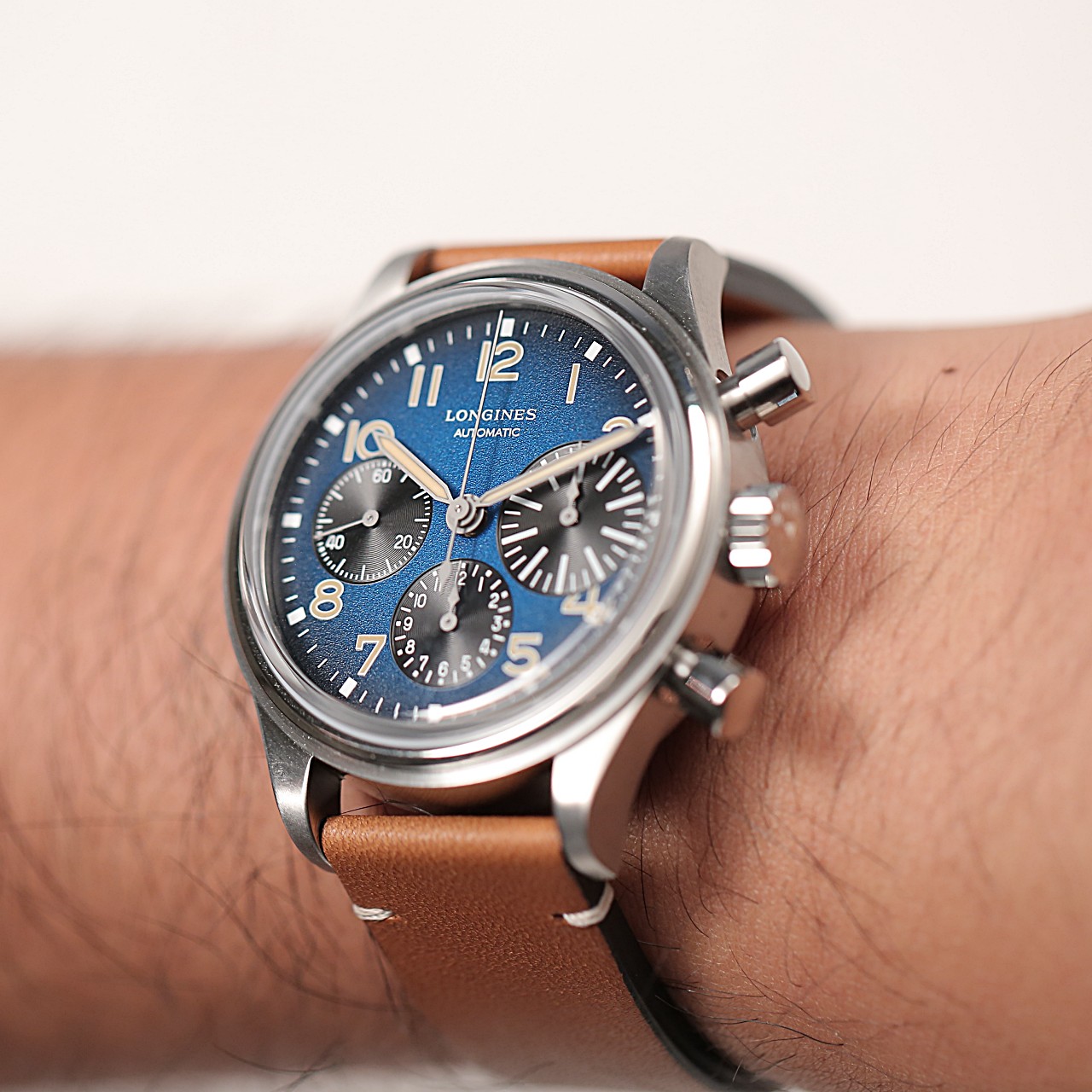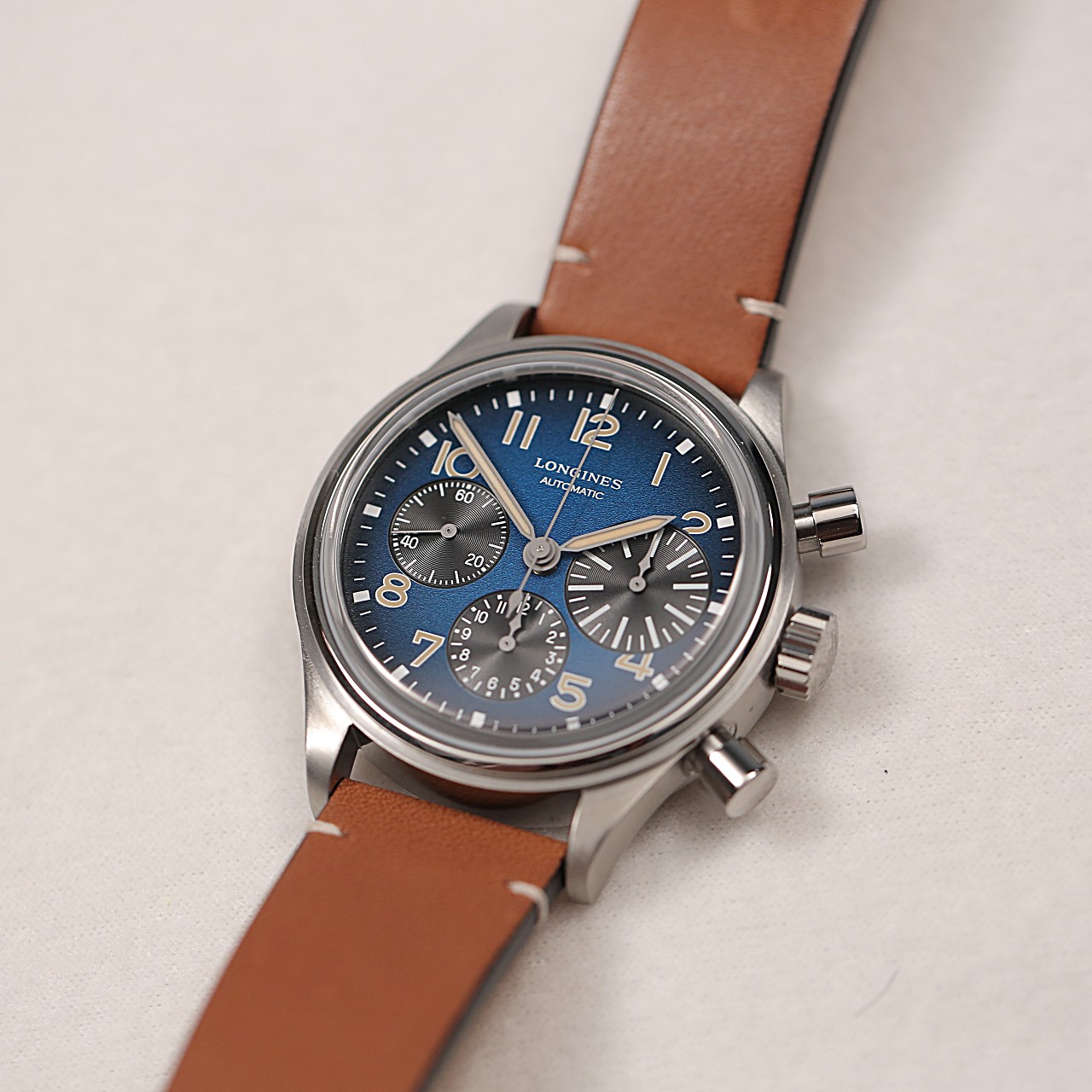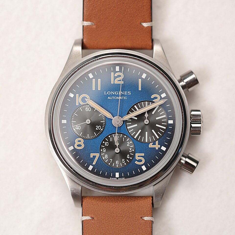 และแล้วโอกาสที่ได้ลองสัมผัส Longines Avigation BigEye Titanium แบบใกล้ชิดก็มาถึง บอกได้เลยว่าเป็นนาฬิกาที่ทำให้รู้สึกประทับใจมาก โดยเฉพาะหน้าปัดสีน้ำเงินไล่เฉดสีอ่อนจากด้านใน ไปจนถึงเข้มที่ด้านนอกได้อย่างเรียบเนียน นอกจากนี้ยังมีการตกแต่งลวดลายบนผิวหน้าปัดแบบพ่นทราย ที่ให้ความรู้สึกร่วมสมัยและมีมิติขึ้นอย่างเห็นได้ชัดจริง ๆ