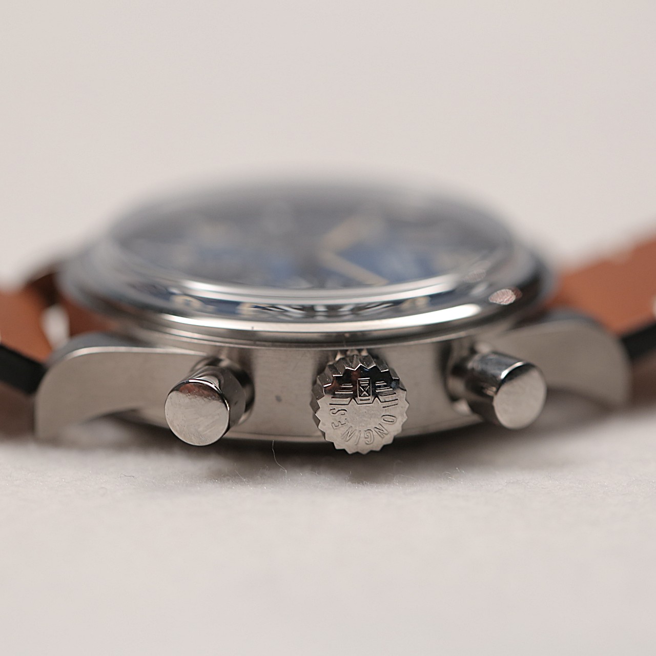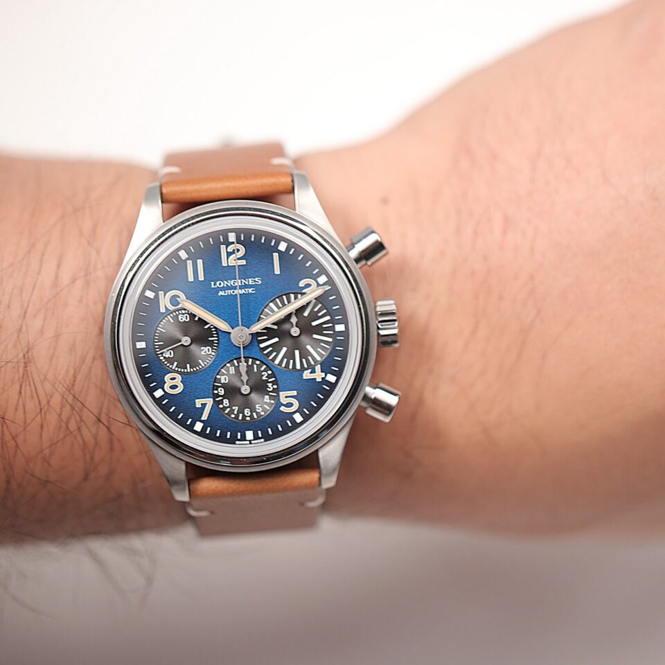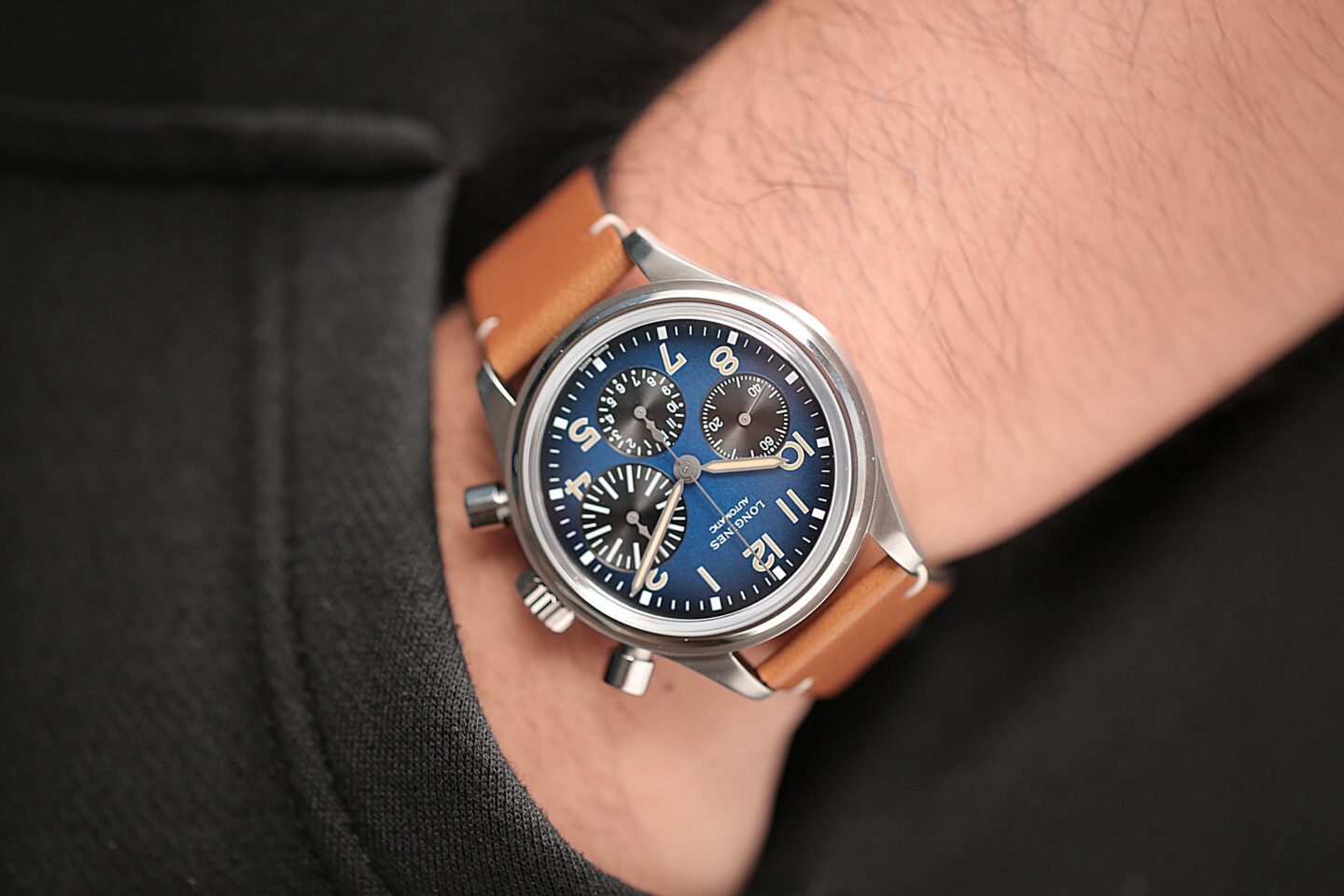และแล้วโอกาสที่ได้ลองสัมผัส Longines Avigation BigEye Titanium แบบใกล้ชิดก็มาถึง บอกได้เลยว่าเป็นนาฬิกาที่ทำให้รู้สึกประทับใจมาก โดยเฉพาะหน้าปัดสีน้ำเงินไล่เฉดสีอ่อนจากด้านใน ไปจนถึงเข้มที่ด้านนอกได้อย่างเรียบเนียน นอกจากนี้ยังมีการตกแต่งลวดลายบนผิวหน้าปัดแบบพ่นทราย ที่ให้ความรู้สึกร่วมสมัยและมีมิติขึ้นอย่างเห็นได้ชัดจริง ๆ