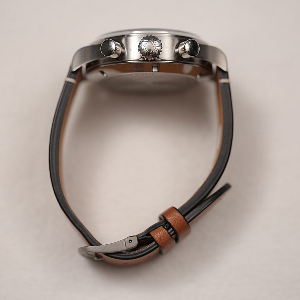 นาฬิกามาพร้อมกับสายหนังลูกวัวเกรดสูงสีน้ำตาลแทน ที่ให้ความรู้สึกหรูหราพร้อมกลิ่นอายนาฬิกาวินเทจ ผิวสัมผัสของสายหนังมีความนุ่มนวล แต่แข็งแรงแน่นหนาเพียงพอสำหรับตัวเรือน Titanium Grade 5 ที่มีขนาดค่อนข้างใหญ่และหนาแต่มีน้ำหนักค่อนข้างเบา โดยมาพร้อมกับตัวล็อกสายแบบหัวเข็มขัดสุดคลาสสิกที่ผลิตจากวัสดุ Titanium Grade 5 แบบเดียวกับตัวเรือน