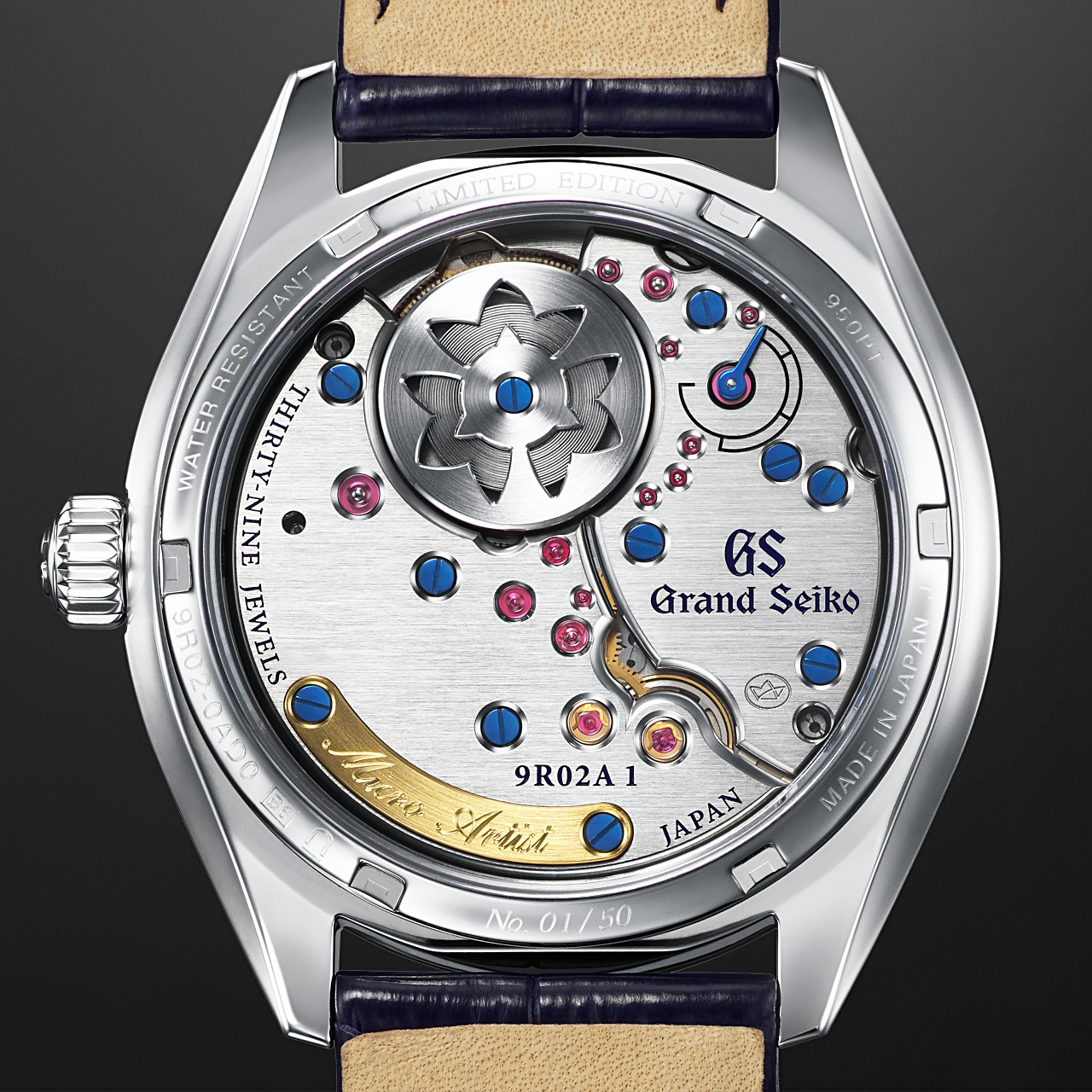 ฝาหลังแบบโปร่งใส โชว์การทำงานของกลไกไขลานระบบ Spring Drive Cal.9R02 สำรองพลังงาน 84 ชั่วโมง โดยสามารถรักษาระดับความเที่ยงตรงถึง ±1 วินาทีต่อวัน (± 15 วินาทีต่อเดือน) ซึ่งกลไกนี้ถูกสร้างสรรค์ขึ้นจากฝีมือของสุดยอดช่างนาฬิกาชายหญิงของ Micro Artist Studio โดยมีการประทับเพลตทองคำสลักตัวอักษร “Micro Artist” ไว้บนสะพานจักรด้านล่าง หรือจะเลือกสลักตัวอักษรอื่น ๆ ได้ตามแต่เจ้าของนาฬิกาต้องการ