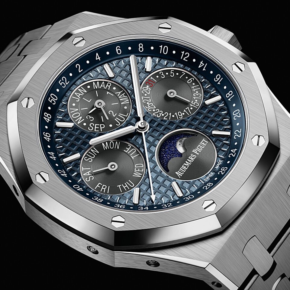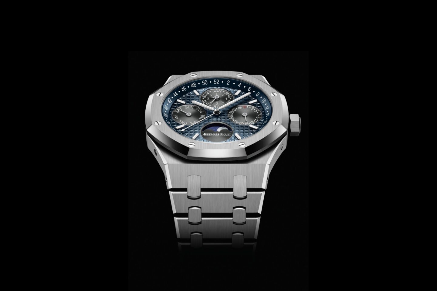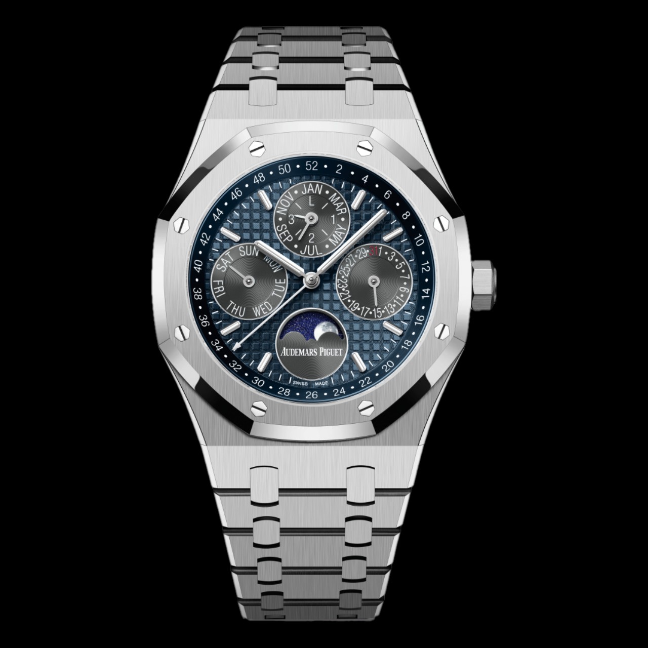 ปีนี้ มีการนำวัสดุ Titanium มาใช้ผลิตตัวเรือนและสายของ Royal Oak Perpetual Calendar อีกครั้งโดยผลิตมาแบบ Normal Production ที่มาพร้อมกับหน้าปัดสีน้ำเงิน สลักลวดลาย “Grande Tapisserie” หน้าปัดย่อย 4 วงสีเทา บอกวันที่, วัน, เดือน, Leap year และ Moonphase บนท้องฟ้าสีน้ำเงินเข้มเข้ากับสีหน้าปัด ขอบหน้าปัดด้านในมีสเกล 52 สัปดาห์ เข็มและมาร์กเกอร์ทั้งหมดเป็นวัสดุ White Gold หยอดพรายน้ำ Super Luminova