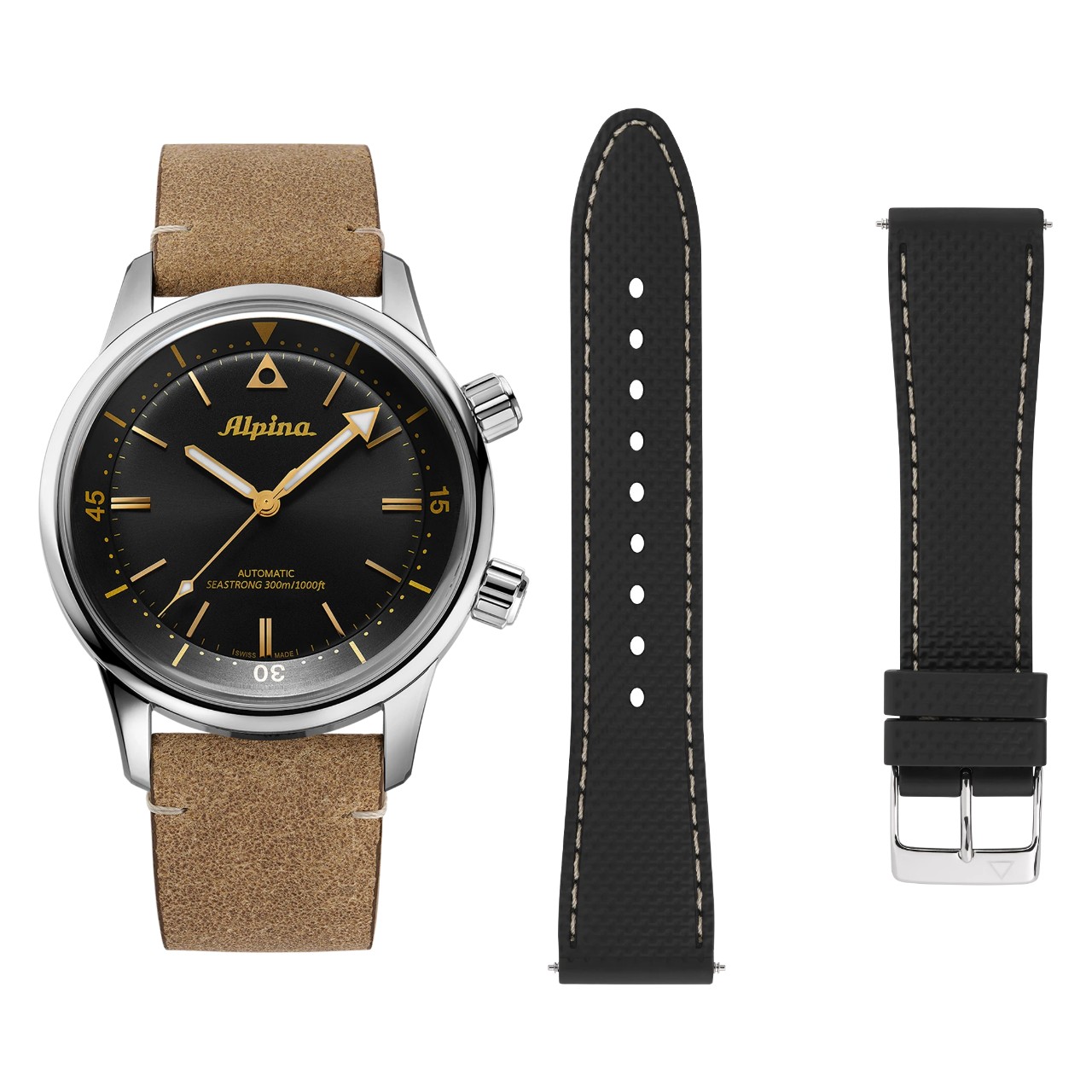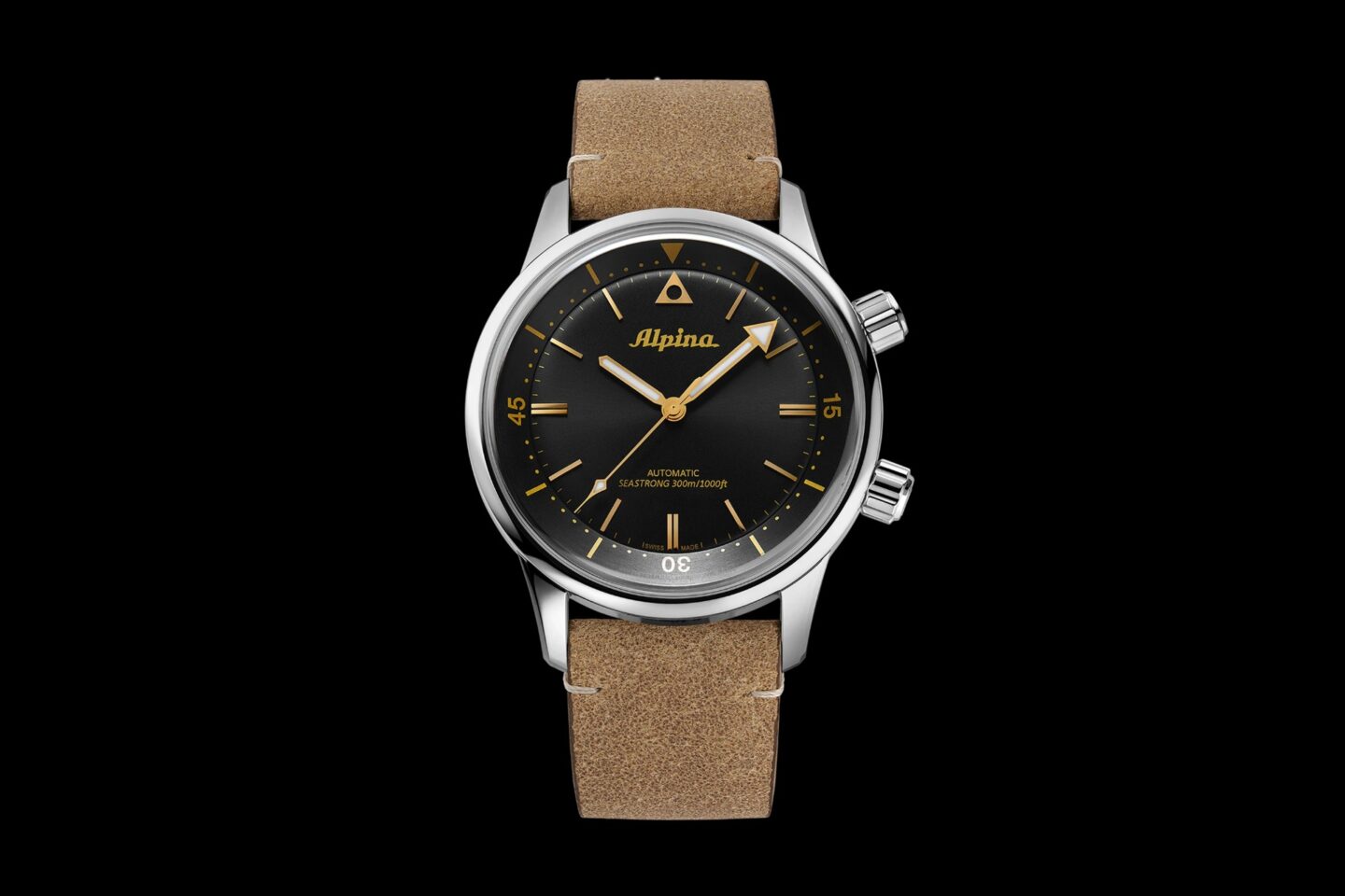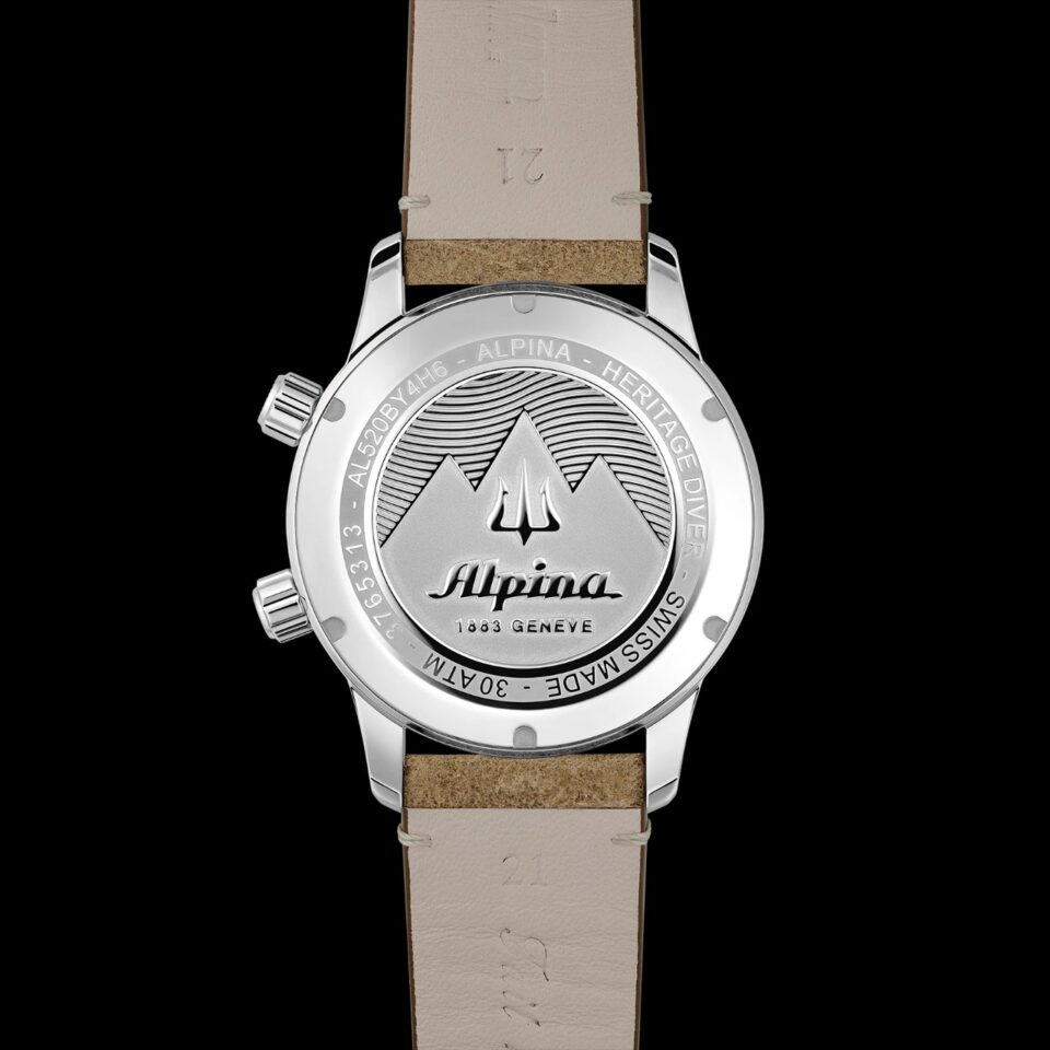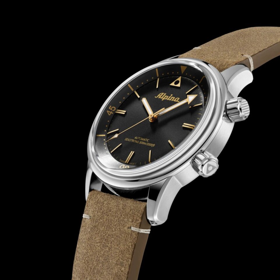 ปีนี้ Alpina นำต้นแบบนาฬิกาดำน้ำระดับตำนานของแบรนด์กลับมาอีกครั้ง โดยมาพร้อมกับหน้าปัดสีดำขัดแต่งลวดลาย Sunray แบบไม่มีวันที่สุดคลาสสิก หลักชั่วโมงและชุดเข็มบอกเวลาสีทองเคลือบสารเรืองแสง Super Luminova สีเบจ โดยเข็มนาทีปลายศรทำงานร่วมกับ Diving Scale สีทอง ที่ปรับตั้งโดยเม็ดมะยมตรงตำแหน่ง 2 นาฬิกา