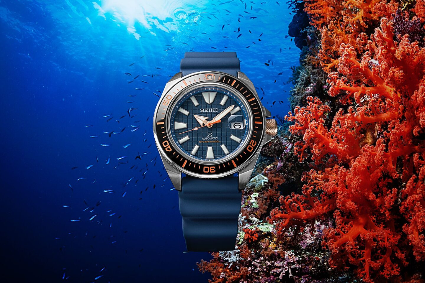 Seiko เลือกใช้สีน้ำเงินที่ได้แรงบันดาลใจจากน้ำทะเลมาใส่ลงบนหน้าปัดสลักลวดลายตาราง และนำสีส้มที่ได้แรงบันดาลใจจากแนวปะการังใต้น้ำใส่ลงบนเข็มวินาที, สเกลตรงหน้าปัดด้านในและบนขอบ Bezel Ceramic สีดำ ชุดเข็มชั่วโมง-นาที เม็ดมะยม และตัวรัดสายเคลือบสี Rose Gold ใช้กระจกหน้าปัด Sapphire เคลือบตัดแสงสะท้อนที่มาพร้อมกับเลนส์ขยายวันที่ตรงตำแหน่ง 3 นาฬิกา