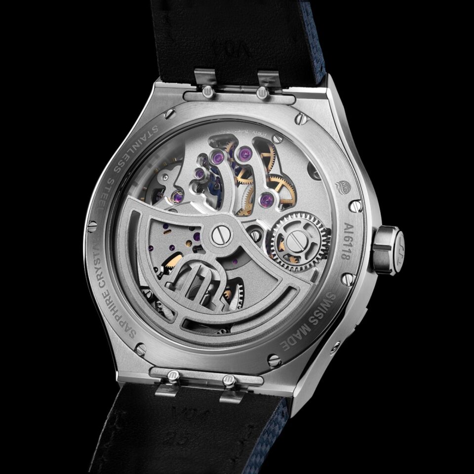 และล่าสุดกับนาฬิกาที่เกิดจากการหล่อหลอมจิตวิญญาณของคอลเลกชั่น Master Piece อันเลื่องชื่อของแบรนด์ เข้ากับคอลเลกชั่นนาฬิกาสปอร์ตหรูอย่าง AIKON ได้อย่างลงตัว โดยการวางหน้าปัดบอกเวลาชั่วโมง-นาที แบบ Off Center สลักลวดลาย Waffle ไว้ตรงตำแหน่ง 2 นาฬิกา ซ้อนกับหน้าปัดย่อยบอกวินาทีตรงตำแหน่ง 4 นาฬิกา มีหน้าต่างวันที่แบบ Big Date ตรงตำแหน่ง 10 นาฬิกา และโชว์การทำงานของ Balance Wheel ที่ยึดไว้กับ Balance Bridge แบบ Skeleton ด้านหน้าปัดตรงตำแหน่ง 8 นาฬิกา โดยทั้งหมดถูกวางไว้บนหน้าปัดสีน้ำเงิน และใช้สารเรืองแสง Super Luminova ที่ชุดเข็มและหลักชั่วโมง