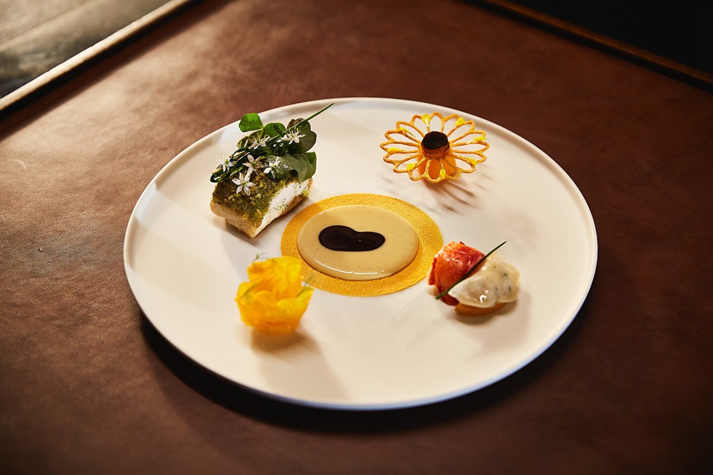 หนึ่งในเมนูเด่น คือ AKI “Ossetra Imperial” Caviar ซึ่งในคอร์สพิเศษนี้ ได้รังสรรค์ปูจักรพรรดิ หรือ king crab เสิร์ฟพร้อมกับไข่ปลาคาเวียร์ เพิ่มรสชาติด้วยสาหร่ายทะเลและควินัว ขณะที่เมนคอร์สของมื้อนี้ สองเชฟภูมิใจนำเสนอเมนู Atlantic Turbot & Blue Lobster ที่นำเอาวัตถุดิบแห่ง ท้องทะเลจากแดนไกลมาเนรมิตให้กลายเป็นจานหลักแสนพิเศษ เนื้อกุ้งมังกรสีฟ้าลวกจนได้ที่เสิร์ฟพร้อมกับปลา turbot จากมหาสมุทรแอตแลนติก เข้ากันได้ดีกับหอยตลับรมควันและซอสไวน์ขาวที่มีความหอมของเนยและน้ำมันใบกระวาน