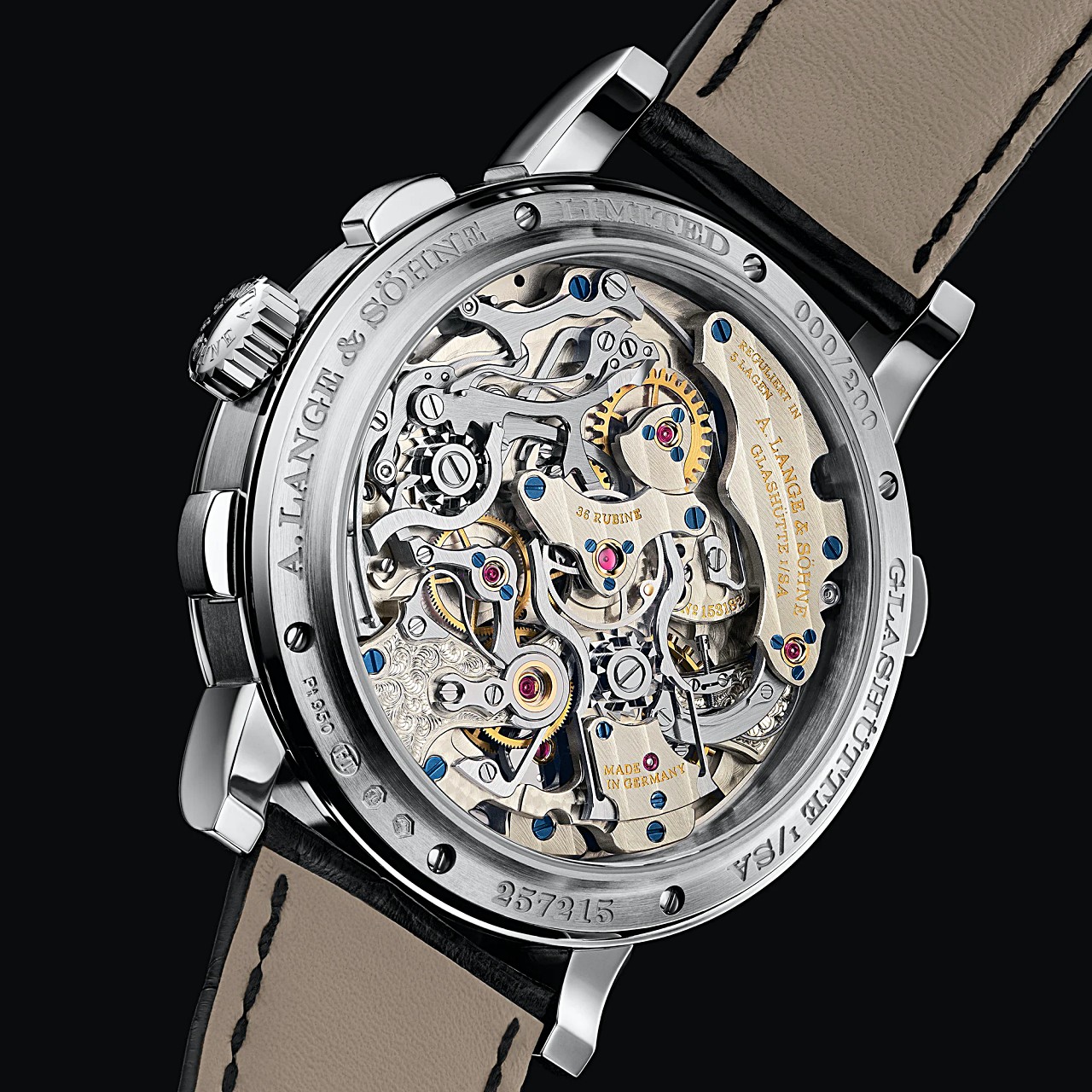 ฝาหลังแบบโปร่งใสสลักหมายเลขประจำเรือน XXX/200 โชว์การทำงานของกลไก Hand Wound In-House Cal.L101.1 ความถี่ 21,600 ครั้ง/ชั่วโมง สำรองพลังงาน 58 ชั่วโมง โดยประกอบไปด้วยชิ้นส่วน 365 ชิ้น ที่ผ่านการขัดแต่งอย่างประณีตงดงาม ตามมาตรฐานของ A.Lange Söhne ใช้กลไก Column Wheel ควบคุมการจับเวลา มีการสลักลวดลายเฉพาะตัวด้วยฝีมือของช่างนาฬิกาแต่ละคนไว้ที่ Balance cock และ Chronograph bridge