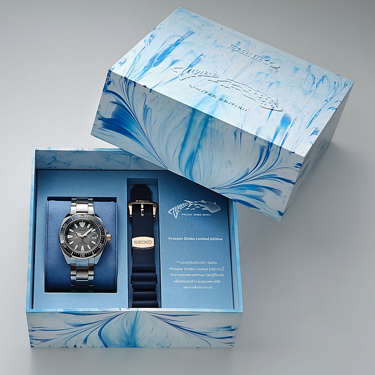 กล่องของ Seiko Prospex Zimbe Limited Edition ทั้ง 2 รุ่นนี้ ถูกผลิตขึ้นจากการนำขยะพลาสติก กลับมาเข้ากระบวนการรีไซเคิลเป็นเม็ดพลาสติก และฉีดขึ้นรูปเป็นกล่อง Zimbe โดยใช้เทคนิคการฉีดพลาสติกที่ทำให้เกิดลวดลายแบบคลื่นทะเลและมีความสวยงามที่แตกต่างกันออกไปไม่เหมือนกันในแต่ละกล่องด้วยความตั้งใจที่อยากช่วยลดขยะพลาสติกทางทะเลและนำขยะมาใช้ให้เกิดประโยชน์ โดยรายได้ส่วนหนึ่งจากการจำหน่ายนาฬิกา Seiko Prospex Zimbe Limited Edition จะถูกนำไปต่อยอดโครงการ Seiko save the ocean เพื่อฟื้นฟูและอนุรักษ์ท้องทะเลไทยต่อเนื่องเป็นปีที่ 6 ต่อไป