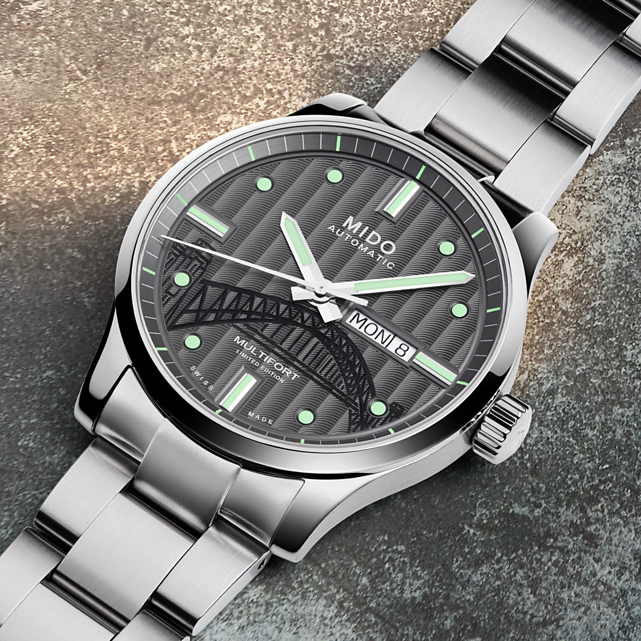 โดยมาถึงนาฬิกาจากคอลเลกชั่น Multifort ที่ได้แรงบันดาลใจจาก ‘Sydney Harbour’ สะพานระนาบเดี่ยวที่ใหญ่ที่สุดในโลกที่ตั้งอยู่กลางอ่าวซิดนีย์ ประเทศออสเตรเลีย ซึ่งถูกสร้างขึ้นในยุค 1930s มาสลักลงบนหน้าปัดนาฬิกาสีเทาร่วมกับลวดลาย Geneva Stripes และมีการเคลือบสารเรืองแสง Super Luminova ลงบนหลักชั่วโมงและชุดเข็มชั่วโมง-นาที มีหน้าต่างบอกวัน-วันที่ตรงตำแหน่ง 3 นาฬิกา และใช้กระจกหน้าปัด Sapphire