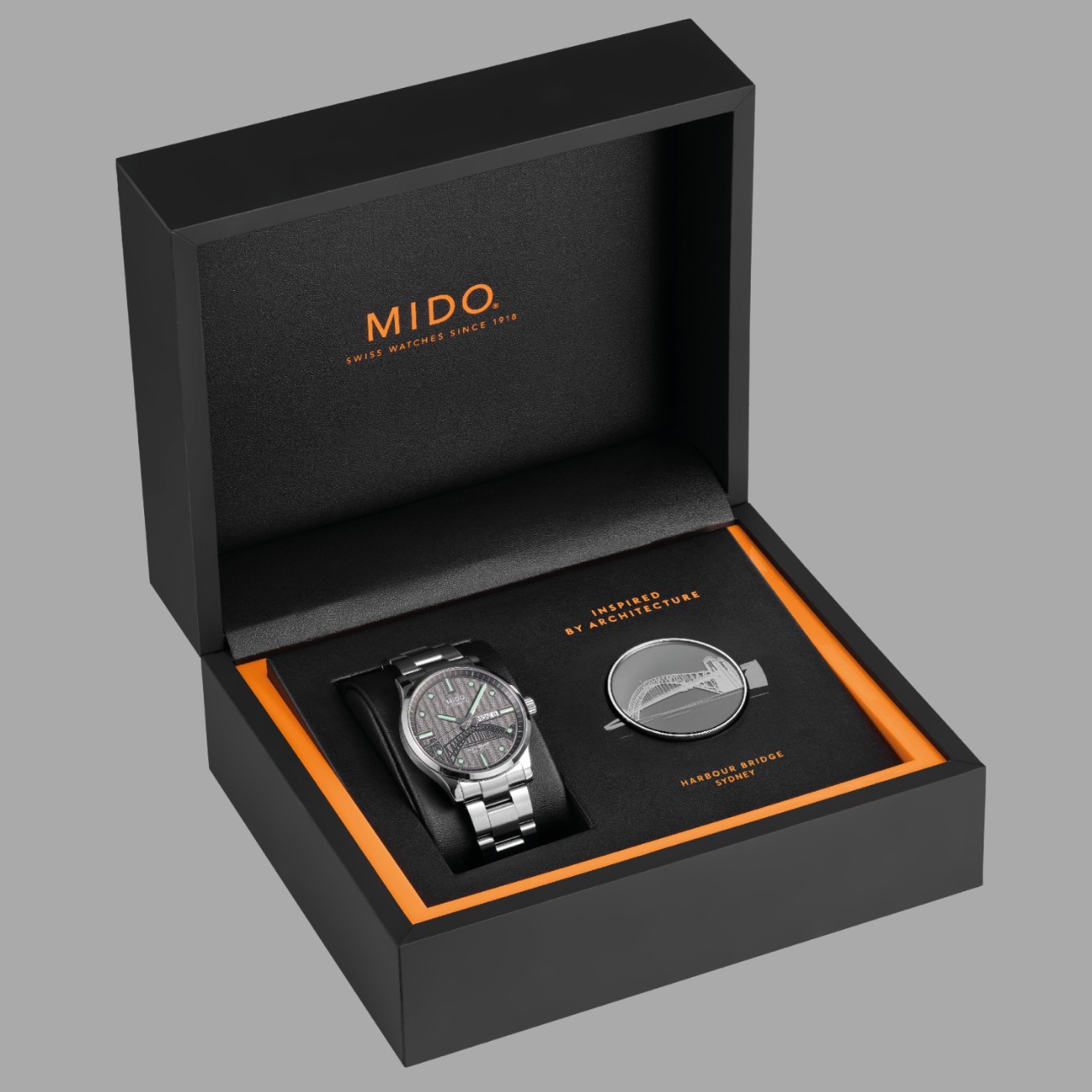 ตัวเรือน Stainless Steel ขนาด 42 มิลลิเมตร หนา 10.9 มิลลิเมตร กันน้ำลึก 100 เมตร ฝาหลังขันเกลียวแบบปิดทึบสลักรูปสะพาน ‘Sydney Harbour’ และหมายเลขประจำเรือน XXXX/1932 ตรงตามปีที่เปิดใช้สะพาน ภายในขับเคลื่อนด้วยกลไก Mido Automatic Cal.80 (base ETA C07.621) สำรองพลังงาน 80 ชั่วโมง และมาพร้อมกับสายนาฬิกา Steel แบบ 3 ข้อ