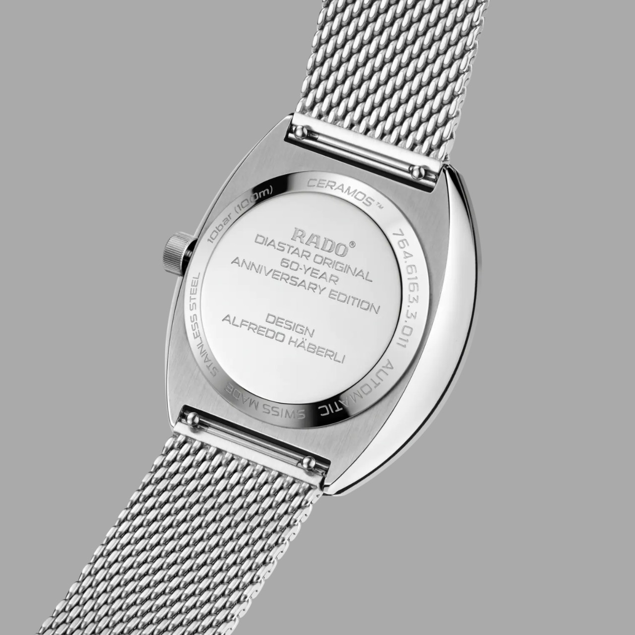 ฝาหลัง Stainless Steel แบบปิดทึบสลักตัวอักษร ‘Rado DiaStar Original 60-Year Anniversary Edition’ และ ‘Design Alfredo Häberli’ ชื่อของนักออกแบบชื่อดังชาวสวิสที่มาร่วมออกแบบนาฬิกาเรือนนี้ โดยภายในขับเคลื่อนด้วยกลไก Automatic Ca.R764 ความถี่ 28,800 ครั้ง/ชั่วโมง สำรองพลังงาน 80 ชั่วโมง ที่มาพร้อมกับสาย Steel แบบ Milanese และสายผ้าสีเทากับ Folding Buckle แบบปุ่มล๊อก ที่ออกแบบเป็นพิเศษสำหรับนาฬิการุ่นนี้โดยเฉพาะ และระบบ Quick Release ที่สามารถเปลี่ยนสายได้อย่างรวดเร็วโดยไม่ต้องใช้เครื่องมือ