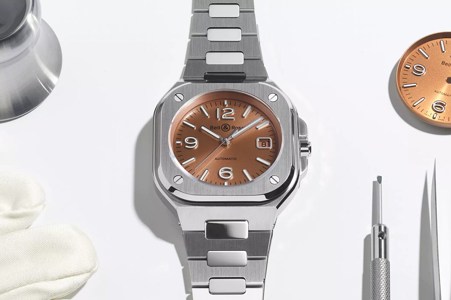 ล่าสุด Bell & Ross เพิ่มสมาชิกใหม่ให้กับคอลเลกชั่น BR 05 ด้วยหน้าปัดสี Copper Brown ที่ผ่านการขัดแต่งลวดลาย Sunburst รวมทั้งจานวันที่ตรงตำแหน่ง 3 นาฬิกา ก็ใช้สีเดียวกับอีกด้วย หลักชั่วโมงแบบหลักขีดสลับเลขอารบิกและเข็มชั่วโมง-นาที เคลือบสารเรืองแสง Super Luminova ใช้กระจกหน้าปัด Sapphire