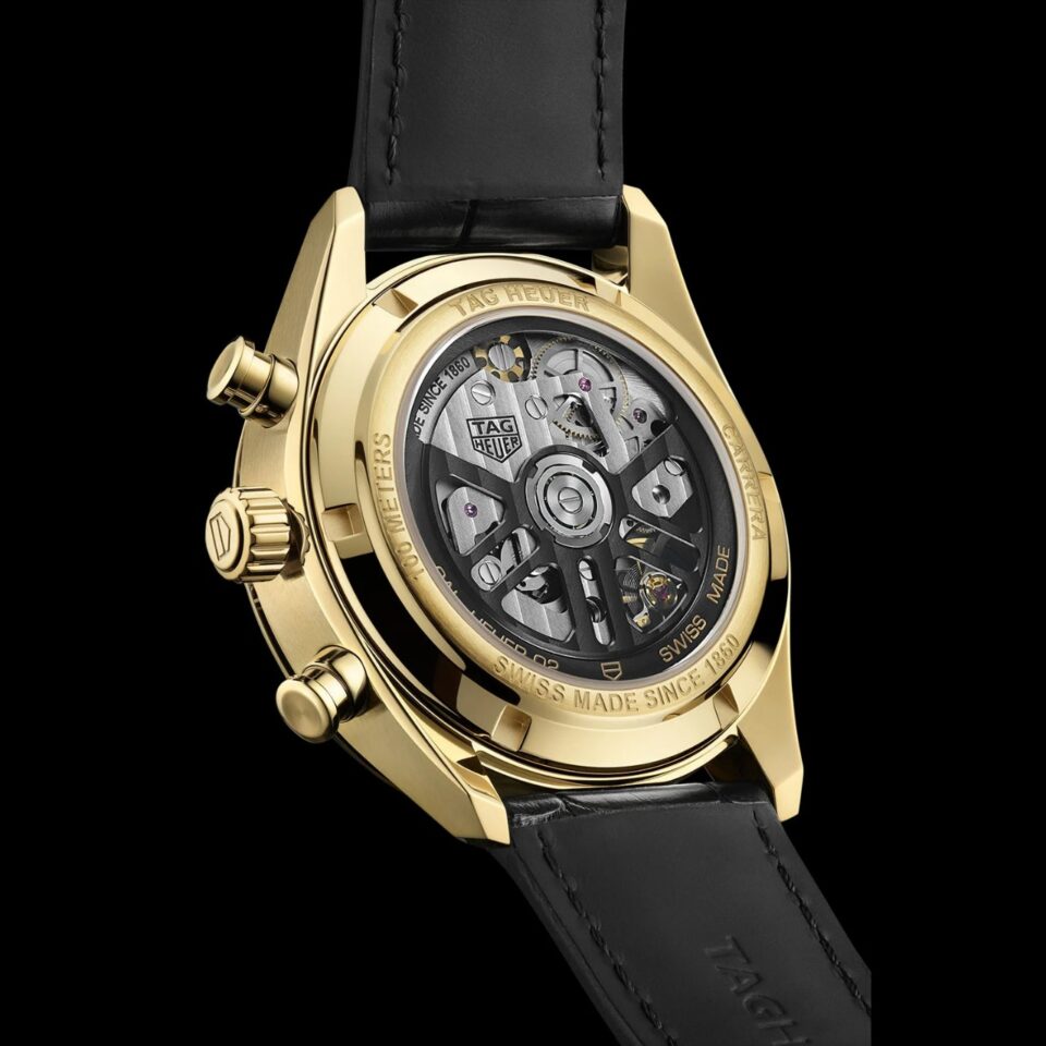 ตัวเรือน Yellow gold 18K 3N ขนาด 42 มิลลิเมตร กันน้ำลึก 100 เมตร ใช้ฝาหลังแบบโปร่งใสโชว์การทำงานของกลไก Automatic Chronograph In-House Cal.Heuer 02 ความถี่ 28,800 ครั้ง/ชั่วโมง สำรองพลังงาน 80 ชั่วโมง พร้อมฟังก์ชั่นจับเวลาต่อเนื่องสูงสุด 12 ชั่วโมง โดยมีการขัดแต่งลวดลาย Coste De Geneva และใช้ Rotor ขึ้นลานที่สลักเป็นลวดลายล้อรถแข่งเคลือบสีดำ และมาพร้อมกับสายหนังจระเข้สีดำกับ Folding Buckle Yellow Gold 18K 3N