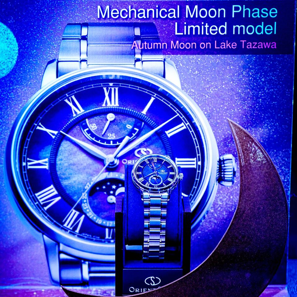 อีกหนึ่งนาฬิกาเรือนที่เปิดตัวได้โดดเด่น Orient Star Mechanical Moon Phase Limited Edition (Ref.RE-AY0116A) ภายใต้แนวคิดและสร้างสรรค์จาก “พระจันทร์ในฤดูใบไม้ร่วงที่ทะเลสาบทาซาวะ” ทะเลสาบทาซาวะตั้งอยู่ในจังหวัดอาคิตะ ซึ่งได้รับการขึ้นทะเบียนเป็น 1 ใน 100 ทะเลสาบที่สวยงามและเป็นทะเลสาบที่ลึกที่สุดในญี่ปุ่นโดยมีระดับความลึกถึง 423 เมตร ตัวเรือนมีความโดดเด่นและน่าหลงใหลด้วยดีไซน์การไล่เฉดสีเทาบนหน้าปัดเปลือกหอยมุกที่สีของหน้าปัดนั้นจะเปลี่ยนไปตามมุมมองและแสงที่ตกกระทบเฉกเช่นเดียวกันกับสีของพื้นผิวของทะเลสาบทาซาวะที่จะเปลี่ยนไปตามภูมิอากาศ นาฬิกามีความพิเศษที่ตรงฟังก์ชั่นแสดงข้างขึ้นข้างแรมด้วยดวงจันทร์สีเงินที่ลอยอยู่บนท้องฟ้ายามค่ำคืน ตัวเรือนมีความกว้าง 41.0 มิลลิเมตรและมีความหนา 13.8 มิลลิเมตร กระจกคริสตัลแซฟไฟร์ทรงโค้งเคลือบสารกันสะท้อน SAR ช่วยให้อ่านค่าเวลาได้อย่างชัดเจน