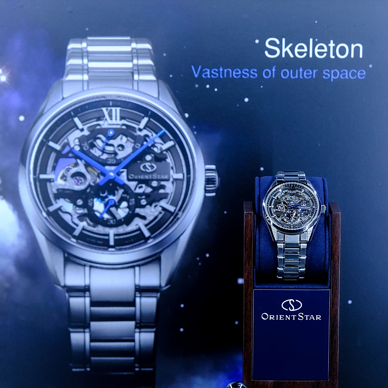 ภายในงานได้จัดการเปิดตัวนาฬิกาพร้อมรูปแบบในคอนเซป Eternal Sky เพราะทุกการเปลี่ยนแปลงคือเสน่ห์ของกาลเวลา รูปแบบนาฬิกาจากดีไซน์ผสานกลไก ที่เปลี่ยนสุนทรียภาพของธรรมชาติสู่การสวมใส่ ทั้ง 3 รุ่น คือ Orient Star เรือนเวลารุ่นใหม่ในสไตล์หน้าปัดแบบ Full Skeleton (Ref.RE-AZ0101N) ภายใต้แนวความคิด “จักรวาลอันกว้างใหญ่” ที่งานออกแบบสะท้อนภาพของห้วงอวกาศและจิตวิญญาณแห่งการสำรวจ ตัวเรือนนาฬิกาสัมผัสได้ถึงความพรีเมียมทั้งในส่วนของวัสดุและกลไกภายในที่มีความโดดเด่นจากการใช้ Escape Wheel ที่ผลิตจากซิลิเซียมด้วยเทคโนโลยี MEMS (Micro-Electro_Mechanical Systems) ซึ่งเป็นเทคโนโลยีที่คิดค้นโดย บริษัท เอปสัน (EPSON) ซึ่งเป็นบริษัทแม่ของแบรนด์ Orient Star อันมีส่วนช่วยให้ชิ้นส่วนที่ได้มีน้ำหนักเบาและมีความเที่ยงตรงสูงโดยชิ้นส่วนนี้ได้รับการออกแบบให้เป็นสีน้ำเงินเพื่อสื่อถึงกาแล็กซี่ทางช้างเผือกที่ตัดกับสีเทาของฐานเครื่องและส่วนอื่นๆ เปรียบเสมือนห้วงจักรวาลอันกว้างใหญ่ ตัวเรือน Stainless Steel คุณภาพสูง ขนาด39 มิลลิเมตร มีผิวสัมผัสเรียบเนียนระดับไฮเอนด์ด้วยการขัดเงาแบบ Sallaz ผสมผสานกับการปัดด้านในบางส่วน ตัวเรือนบางพอดีและกระชับกับข้อมือด้วยความหนาเพียง 10.8 มิลลิเมตร ตอบโจทย์สำหรับผู้ที่ต้องการความคล่องตัว สายโลหะให้สัมผัสสบายขณะที่สวมใส่และจุดเด่นอยู่ตรงเข็มนาฬิกาสีน้ำเงินที่ให้ความรู้สึกผ่อนคลายเหมาะอย่างยิ่งกับการเป็นนาฬิกาที่ใช้งานในทุกวันและสิ่งสำคัญที่สุดได้แก่การบอกเวลาอย่างเที่ยงตรงผ่านการทำงานของเครื่อง in-house caliber F8B6 ระบบไขลานที่สำรองพลังงานได้อย่างมีประสิทธิภาพถึง 70 ชั่วโมงด้วยค่าความคลาดเคลื่องเพียง +15 ถึง -5 วินาทีต่อวัน