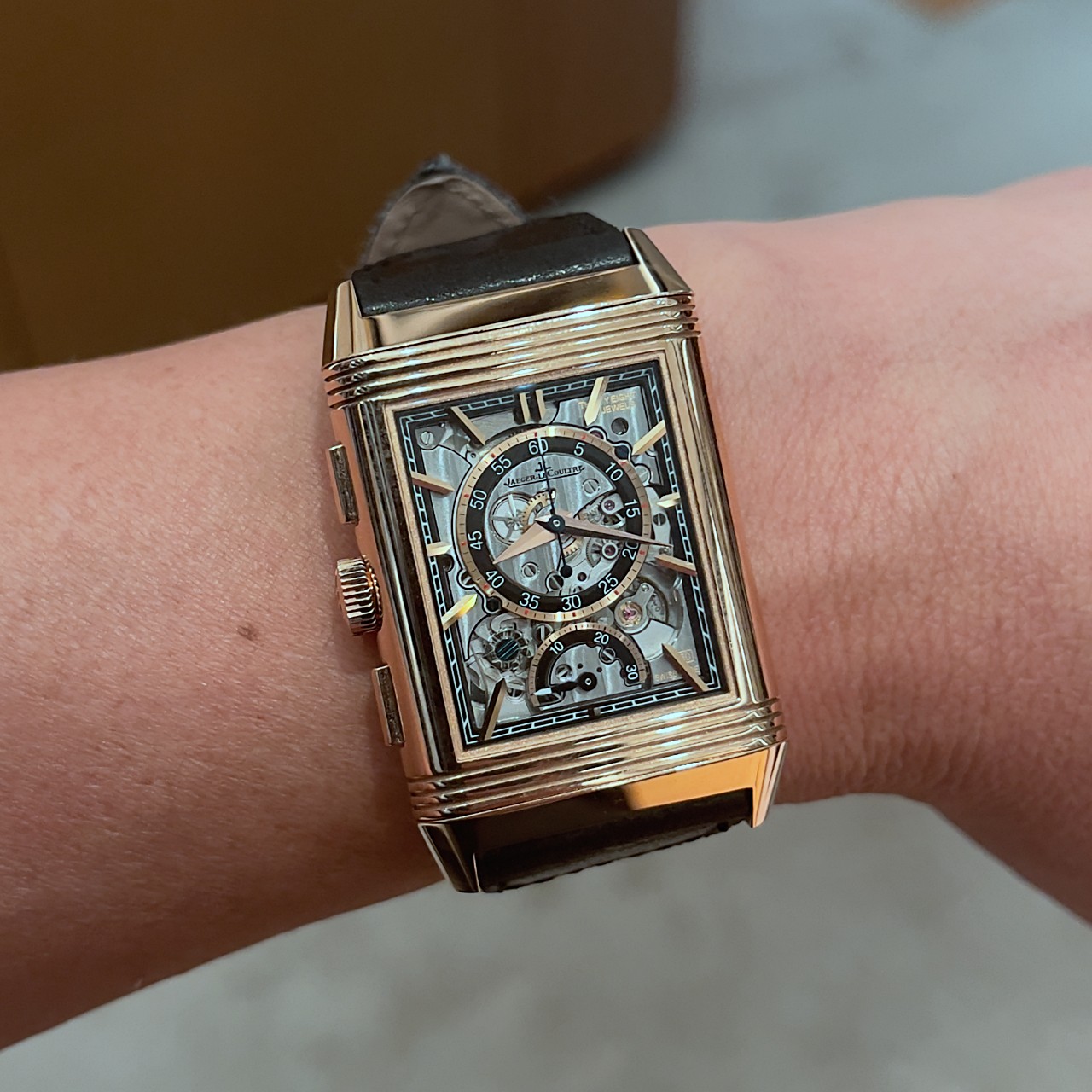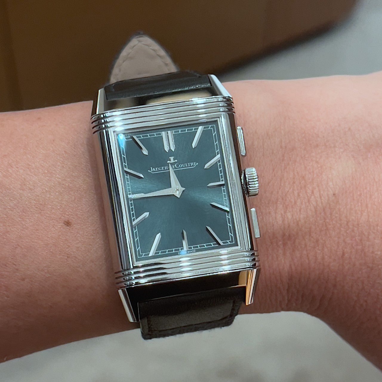 เริ่มต้นกันที่ Reverso Tribute Chronograph นาฬิกาจับเวลาในตัวเรือนสี่เหลี่ยมพลิกได้ ที่ถูกนำกลับมาผลิตอีกครั้งในรอบ 20 ปี โดยมีการวางรูปแบบหน้าปัดได้อย่างลงตัวด้วยหน้าปัดหลักโทนสีเทาอมฟ้าที่ถูกขัดแต่งด้วยเทคนิค Sunray ที่เล่นแสงได้อย่างงดงามมาก ๆ และเรียบง่ายด้วยการบอกเวลาแบบ 2 เข็ม ทรง Dauphine และหลักชั่วโมงทรง Baton ปลายแหลม และสเกลนาทีแบบรางรถไฟสุดคลาสสิก