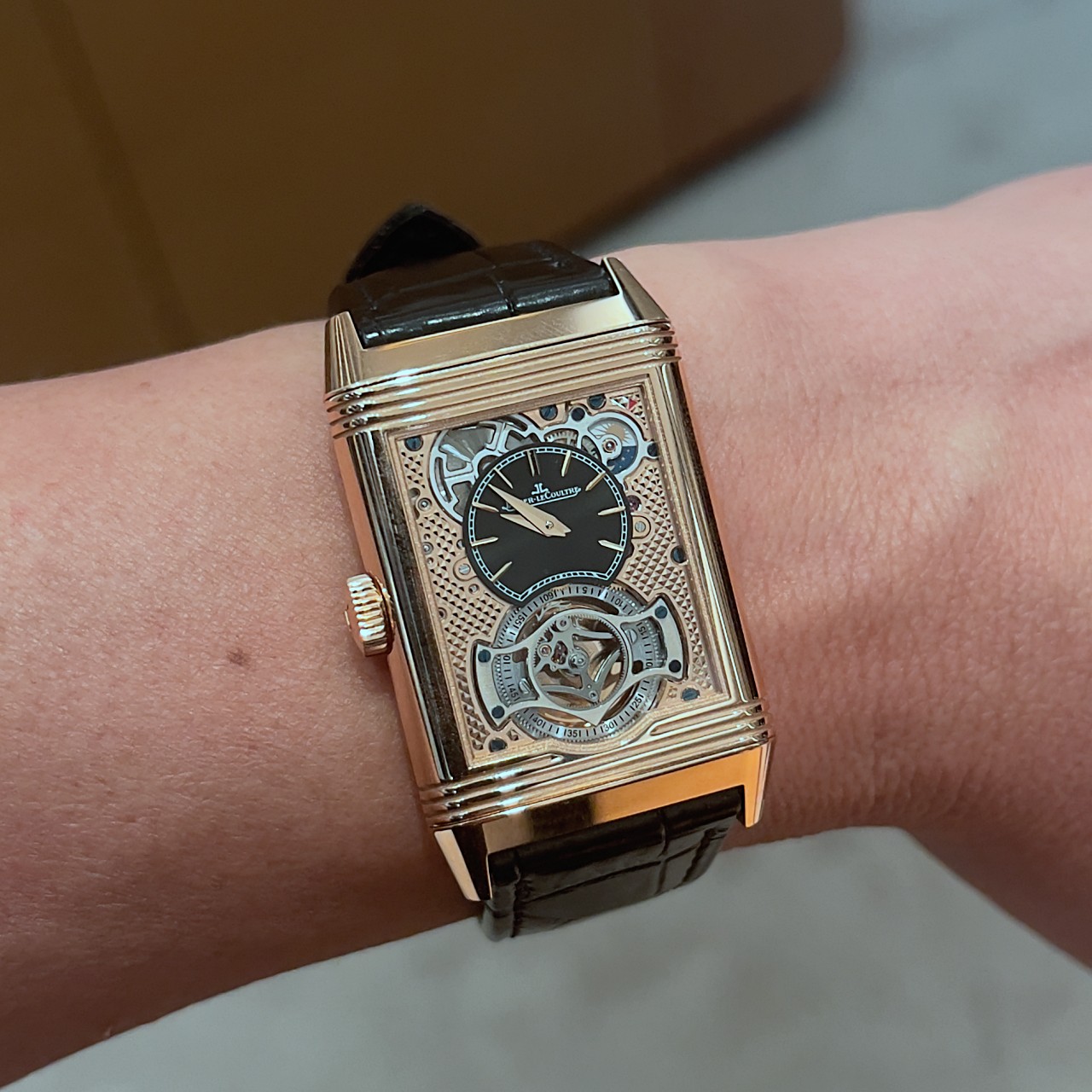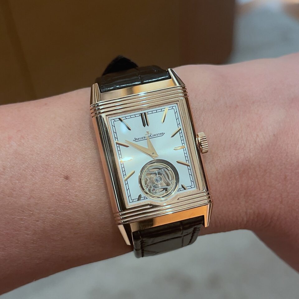 ต่อด้วยนาฬิกา Reverso Tribute Duoface Tourbillon นาฬิกาบอกเวลาแบบ 2 เขตเวลาด้วยหน้าปัดสองหน้า ที่มาพร้อมกับฟังชั่น Flying Tourbillon ที่ถูกทำให้กรง Tourbillon เหมือนล่องลอยอยู่กลางช่องตรงตำแหน่ง 6 นาฬิกา บนหน้าปัดสีเงินที่ผ่านการขัดแต่งด้วยลวดลาย Sunray ที่เล่นแสงได้อย่างงดงามมาก ๆ และเรียบง่ายด้วยการบอกเวลาแบบ 2 เข็ม ทรง Dauphine และหลักชั่วโมงทรง Baton ปลายแหลม และสเกลนาทีแบบรางรถไฟสุดคลาสสิกตามแบบฉบับของนาฬิกาในซีรีย์ Tribute