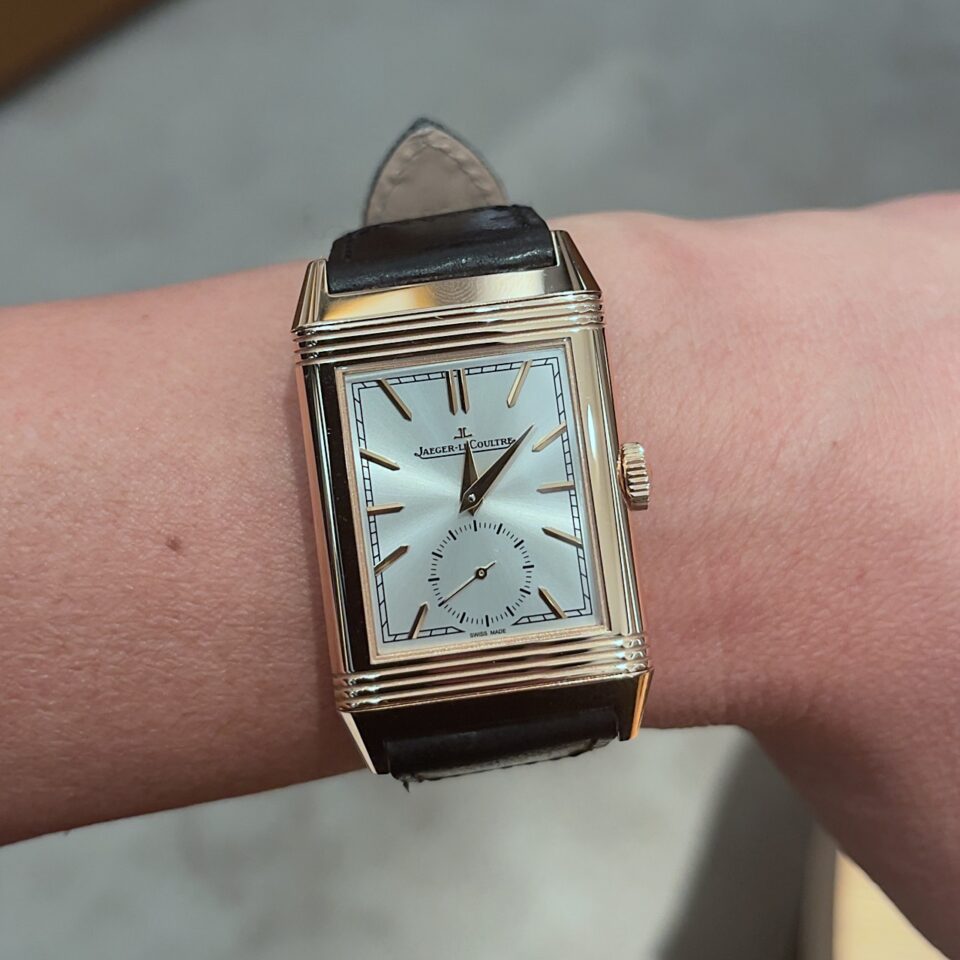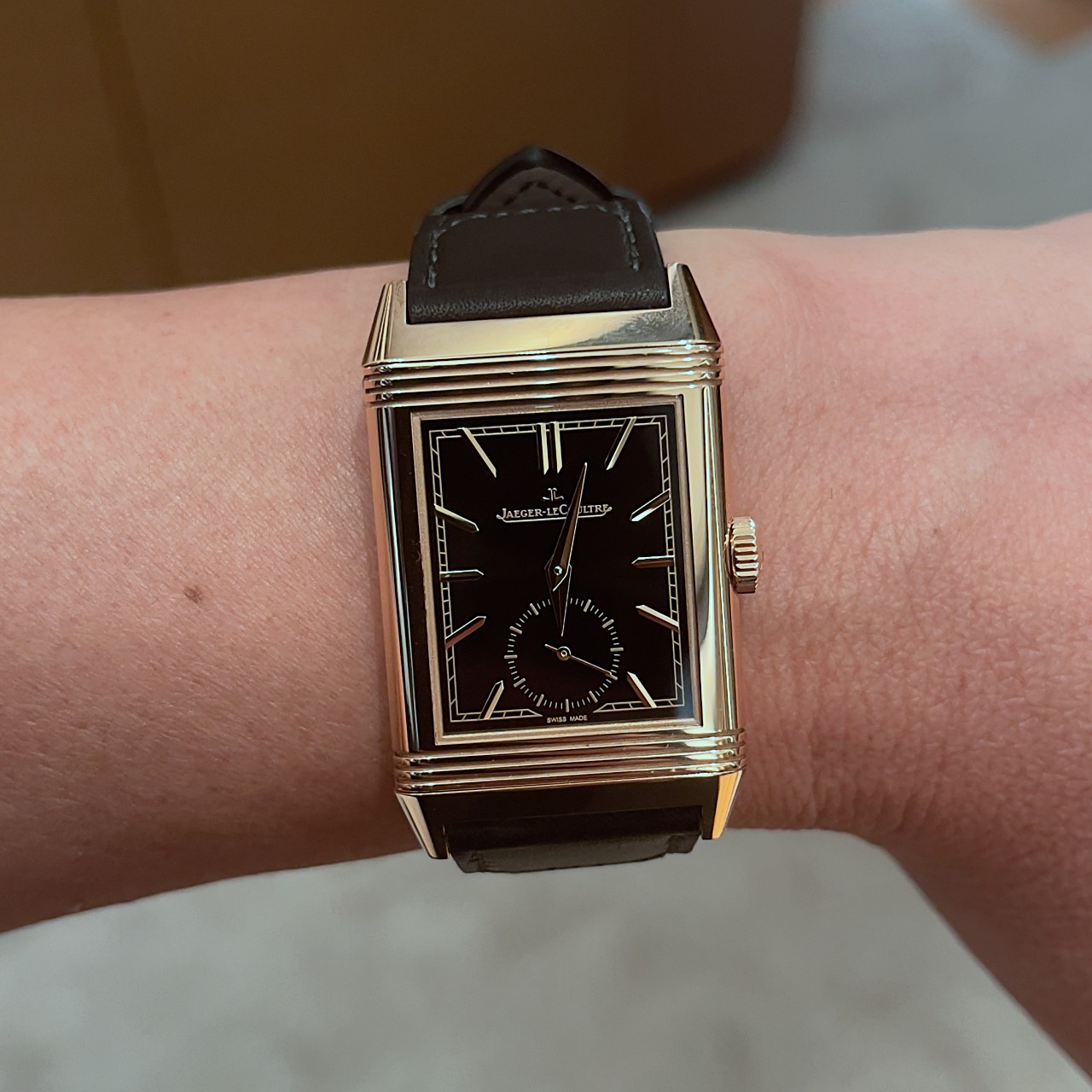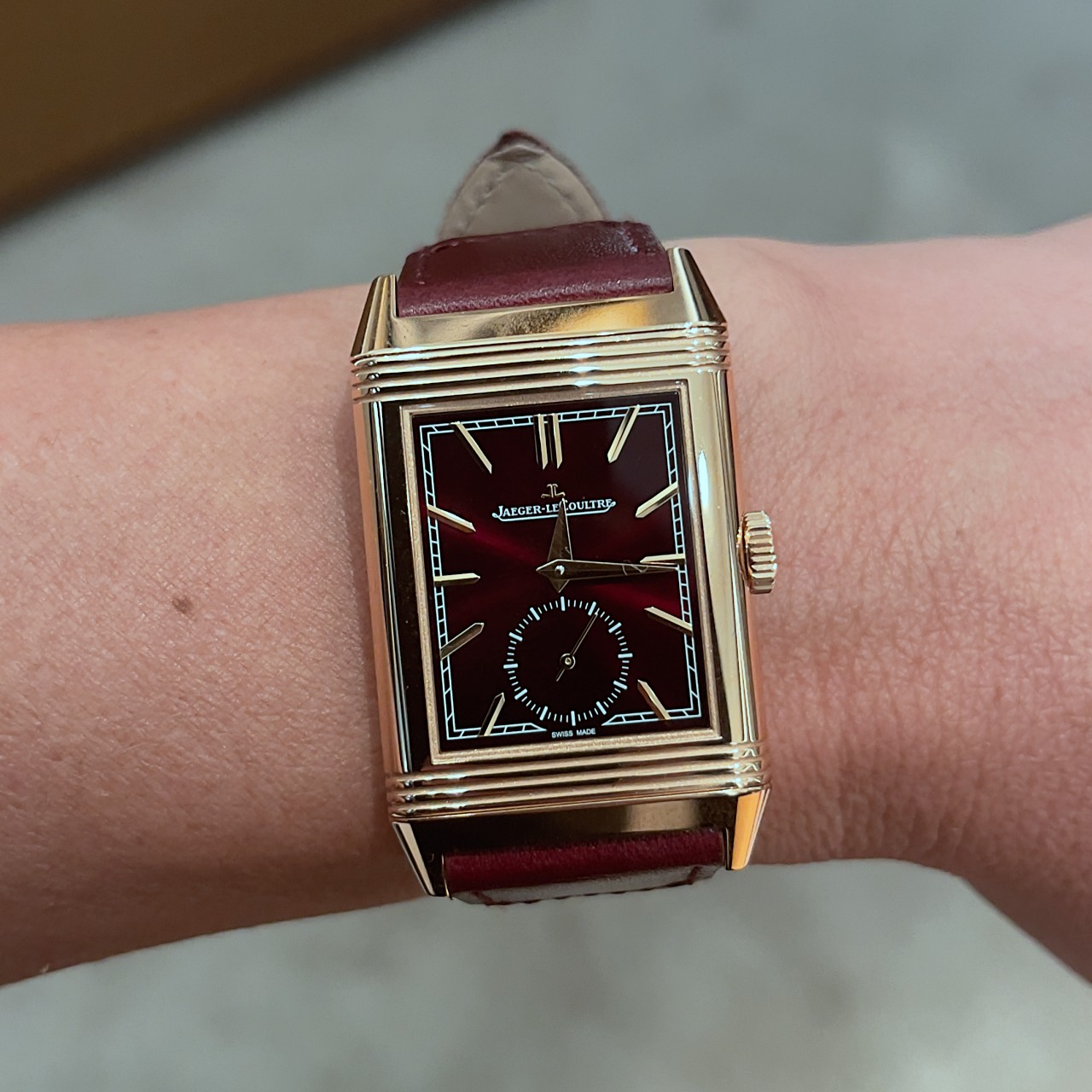 นอกจากนี้คอลเลกชั่น Reverso Tribute Monoface Small Seconds ยังมีรุ่นตัวเรือน Pink Gold 18K ให้เป็นทางเลือกสำหรับผู้ที่ชื่นชอบความหรูหรา โดยมีความแตกต่างจากรุ่นตัวเรือน Steel ด้วยการลดความหนาของตัวเรือนลงประมาณ 1 มิลลิเมตร ซึ่งเราสามารถสัมผัสถึงความแตกต่างได้อย่างชัดเจนตอนสวมใส่ลงบนข้อมือ และพร้อมหน้าปัดให้เลือก 3 แบบ ได้แก่ สีดำ, สีเงิน และสีเบอร์กันดีที่มาพร้อมกับสายหนัง Fagliano สีเบอร์กันดีเย็บประกบกับผ้าใบโทนสีเดียวกัน