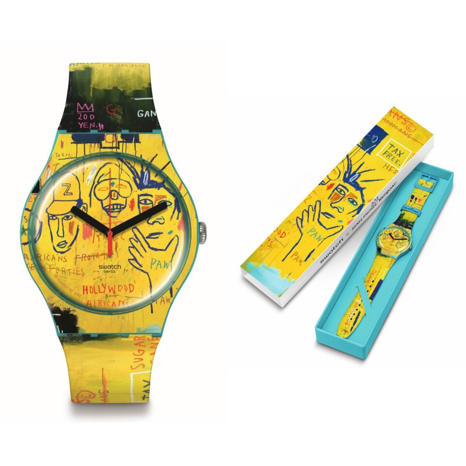 HOLLYWOOD AFRICANS นาฬิกาเรือนนี้ถูกแต่งแต้มจากผลงานศิลปะในปี 1983 ที่ได้มีการเล่าถึงเรื่องราวการเหมารวมที่กลุ่มชนแอฟริกันอเมริกันต้องพบเจอในวงการบันเทิงและสังคมอเมริกัน โดยบนหน้าปัดสีเหลืองสดใสนั้นเป็นภาพวาดใบหน้าของ BASQUIAT กับ Rammellzee (แรปเปอร์) และ Toxic (จิตรกร) ซึ่งทั้งสามคนเป็นเพื่อนที่เดินทางร่วมกันมาจากนิวยอร์ก นอกจากนี้ทั่วทั้งตัวเรือนยังเต็มไปด้วยข้อความ รูปภาพ และเครื่องหมายเชิงนามธรรมที่สะท้อนเอกลักษณ์และพลังงานของ BASQUIAT ได้เป็นอย่างดี Ref.SUOZ354 ราคา 3,750 บาท
