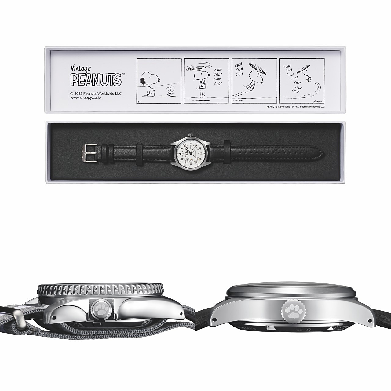 การร่วมมือกันในครั้งนี้ Seiko ได้เลือกใช้ตัวเรือนที่ได้รับความนิยมมาอย่างต่อเนื่องในรุ่น SKX Sports Style รหัส SRPK25Kโดยมีเจ้า Snoopy และ Sport Field Style รหัส SRPK27K โดยมีเจ้า Snoopy สุนัขพันธุ์บีเกิ้ลที่เป็นตัวละครดาวเด่นมาอยู่บนหน้าปัดสีขาว พร้อมกับเพื่อนรักอย่างเจ้านก Woodstock โดยมีการเคลือบสีแดงไว้ที่เข็มวินาที และในส่วนของเข็มชั่วโมง-นาที รวมทั้งหลักชั่วโมงสีเงินมีการเคลือบสารเรืองแสง Lumibrite และมีหน้าต่างบอกวัน-วันที่ อันเป็นเอกลักษณ์ของ Seiko 5 Sports มาตั้งแต่ปี 1968
