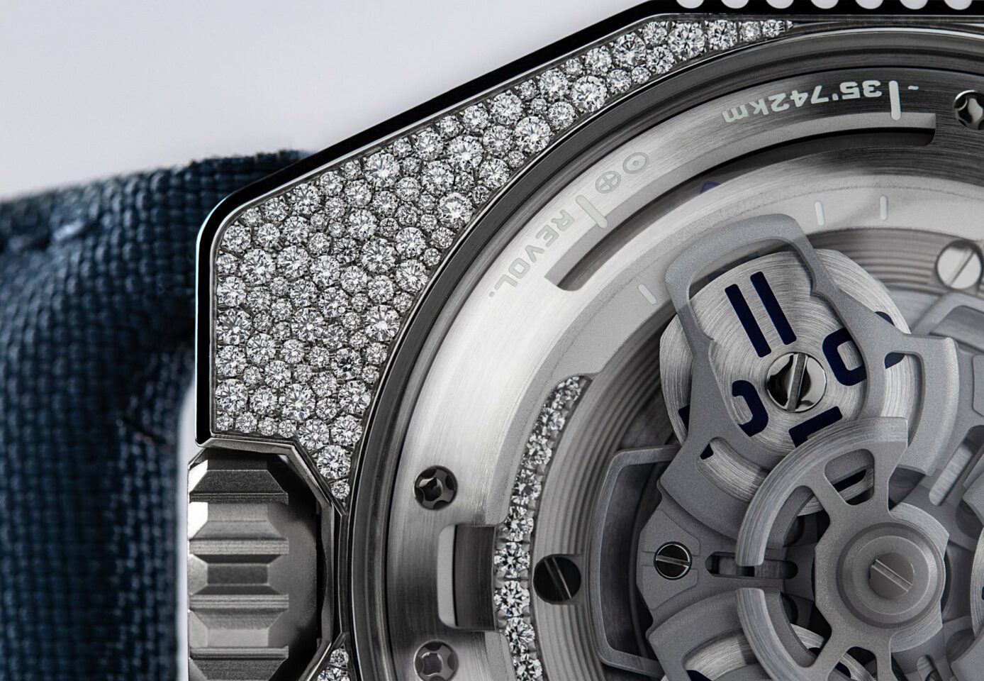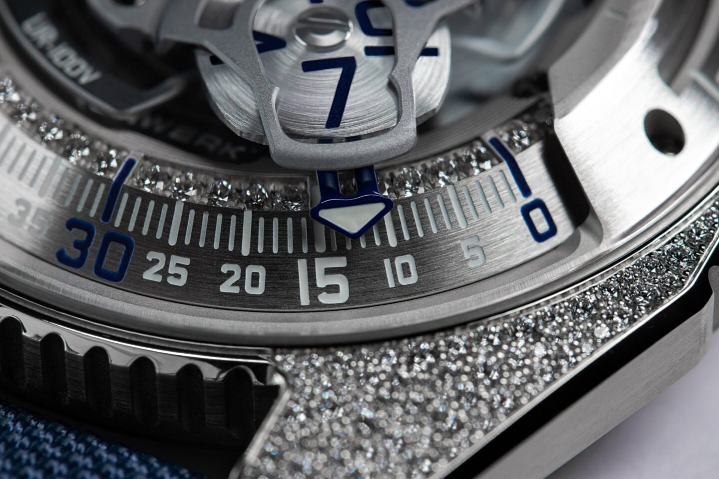 ด้วยรูปทรงที่แตกต่างกันถึงแปดแบบ จัดวางประดับลงบนตัวเรือน Stainless Steel ของนาฬิกา UR-100V Stardust เหลือเพียงขอบเท่านั้นที่เปลือยเปล่า สเกลนาทีซึ่งอยู่ตรงด้านบนของเส้นขอบหน้าปัดนั้นประดับด้วยเพชร 36 เม็ด ในขณะที่อีก 24 เม็ดประดับตรงบริเวณเม็ดมะยมของนาฬิกา โครงสร้างตัวเรือนที่เงียบง่ายแต่ชวนให้หลงใหล ถือเป็นผลลัพธ์มาจากงานฝีมือการตกแต่งเพชรที่พิถีพิถันและซับซ้อน