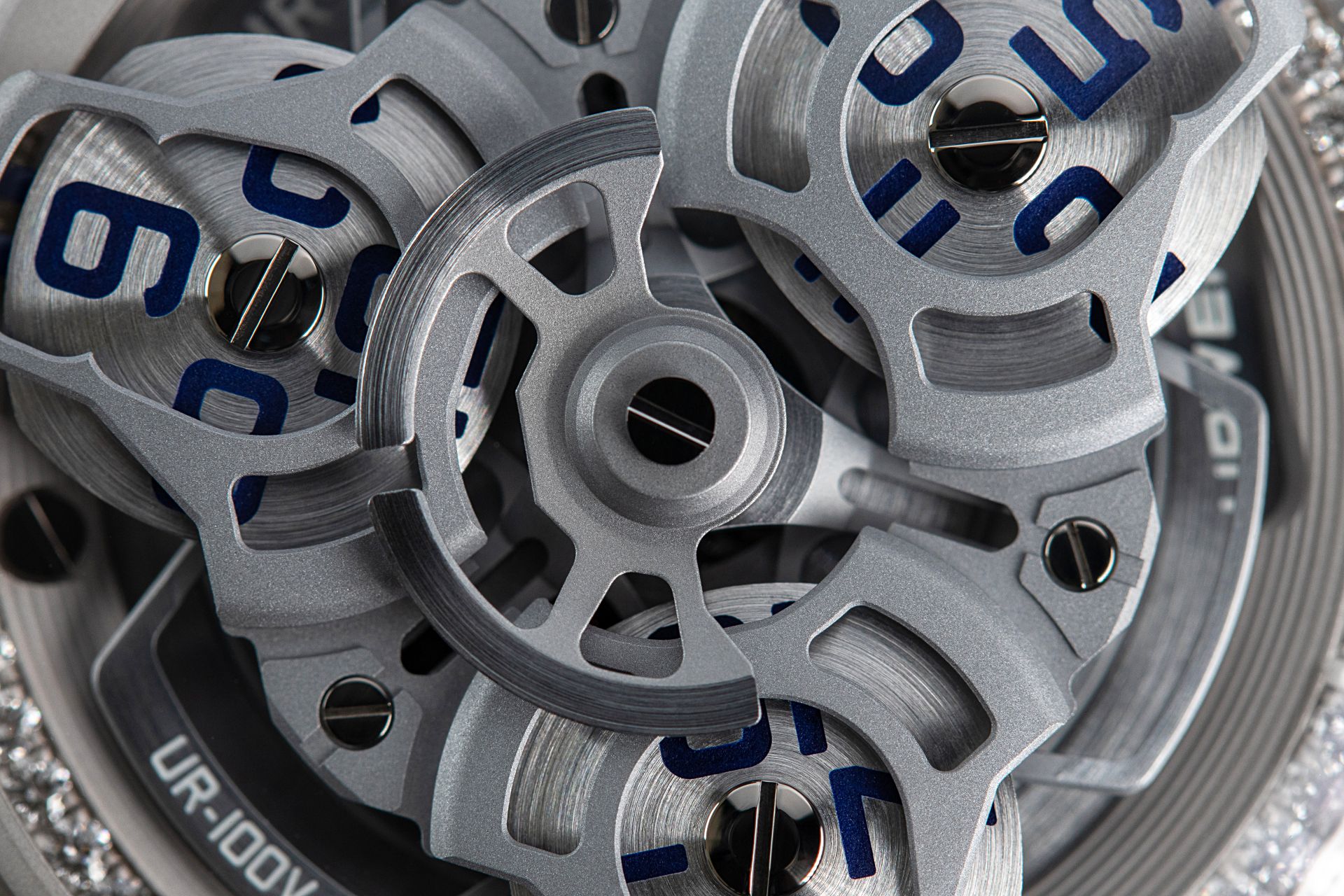 ภายในตัวเรือนนาฬิกาที่บรรจุกลไกไขลานอัตโนมัติ UR 12.02 เดินด้วยความถี่ 28,800 ครั้งต่อชั่วโมง สามารถสะสมพลังงานได้นาน 48 ชั่วโมง โดยนาฬิกา UR-100V Stardust มาพร้อมสายผ้าสีน้ำเงิน Bultimore พร้อมตัวล็อคสายแบบหัวเข็มขัด Stainelss Steel ขัดแต่งผิวด้วยเทคนิค Blasted ประดับด้วยเพชรน้ำงามเจียระไนแบบเหลี่ยม 22 เม็ด โดยนาฬิการุ่นนี้สามารถขึ้นผลิตเพียง 10 เรือนต่อปี เท่านั้น