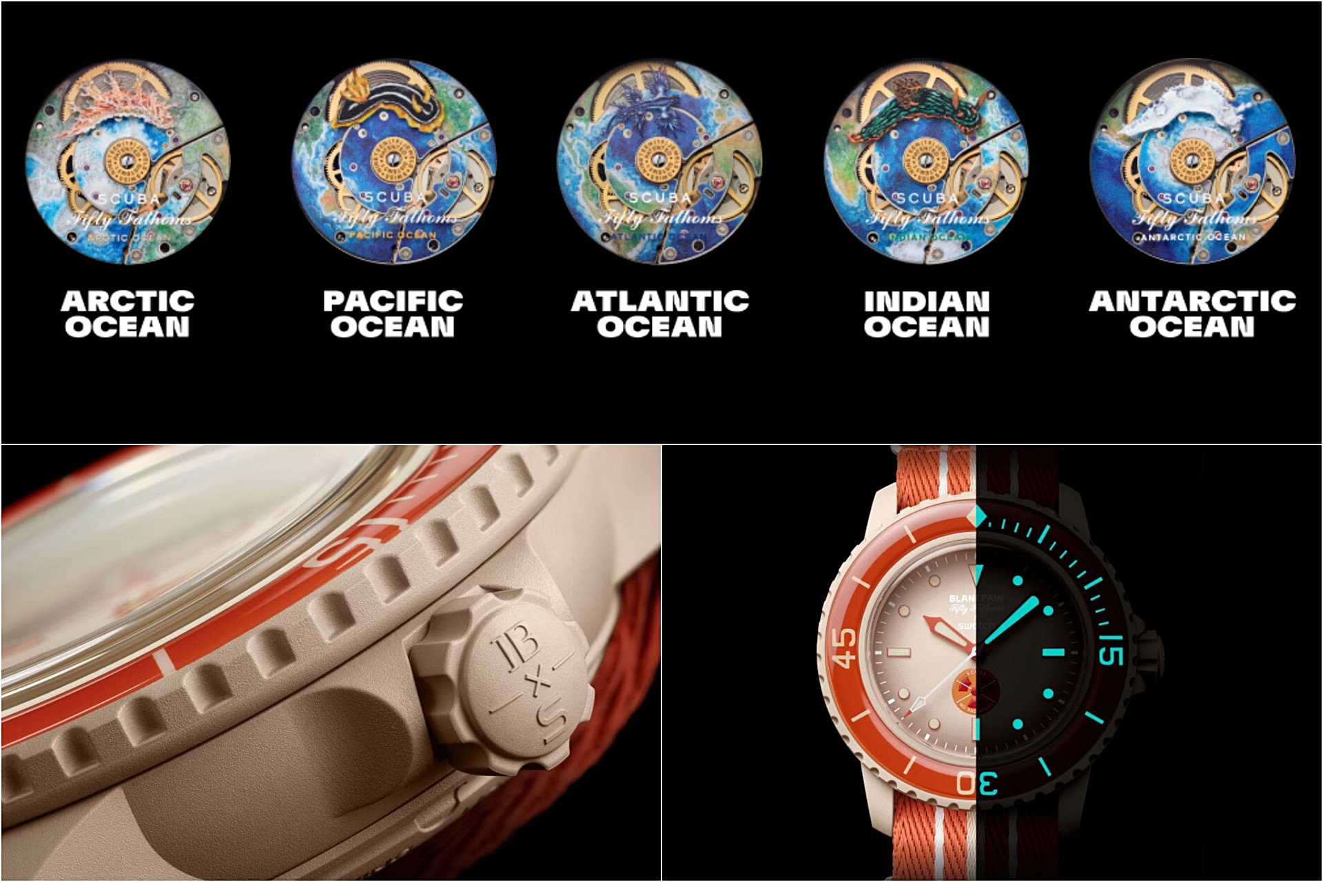 เริ่มต้นที่รุ่น Arctic Ocean Bioceramic Fifty Fathoms ตัวแทนมหาสมุทรอันหนาวเย็น ที่มาพร้อมกับหน้าปัดโทนสีน้ำตาลไล่เฉด หลักชั่วโมงและชุดเข็มสีส้มเคลือบสารเรือง Super Luminova สีเบจ มีการพิมพ์สัญลักษณ์ “NO RADIATIONS” ไว้ตรงตำแหน่ง 6 นาฬิกา และไม่มีหน้าต่างบอกวันที เพื่อเป็นการระลึกถึงนาฬิกาดำน้ำระดับมืออาชีพเรือนแรกของโลกในยุค 1960s ที่ผลิตขึ้นโดยปราศจากการใช้สาร Radium หลักชั่วโมงและเข็มชั่วโมง-นาที สีส้ม เข็มวินาทีสีขาวเคลือบสารเรืองแสง Super Luminova โดยมาพร้อมกับสายผ้า NATO สีส้มสลับสีขาวที่ผลิตจากอวนประมงที่ผ่านการรีไซเคิล ในตัวเรือน Bioceramic สีเบจและ Diving Scale Insert สีส้ม เคลือบสารเรืองแสง Super Luminova เหมือนนาฬิกา Fifty Fathoms
