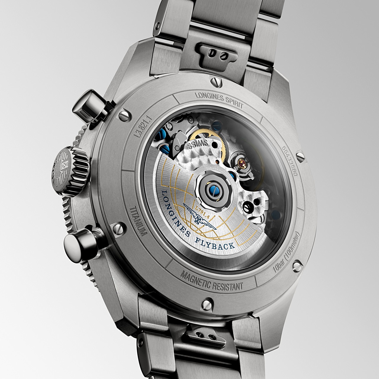 ล่าสุด Longines ต่อยอดจิตวิญญาณแห่งผู้บุกเบิกให้กับนาฬิการะดับตำนานในคอลเลกชั่น Spirit อีกครั้ง ด้วยการเพิ่มรุ่นตัวเรือนและสายที่ผลิตจากวัสดุ Titanium ให้กับนาฬิกา Spirit Flyback ที่มาพร้อมกับหน้าปัดโทนสีดำด้านที่ตัดกับเส้นสายสีทองของชุดเข็มบอกเวลาและเข็มจับเวลาในหน้าปัดย่อยแบบ Bi-Compax รวมทั้งหลักชั่วโมงตัวเลขอารบิกที่มีการเคลือบสารเรืองแสง Super Luminova และมีการใช้สีแดงที่ปลายเข็มจับเวลาและคำว่า “Flyback” ตรงตำแหน่ง 6 นาฬิกา ใช้กระจกหน้าปัด Sapphire เคลือบตัดแสงสะท้อนแบบโค้ง