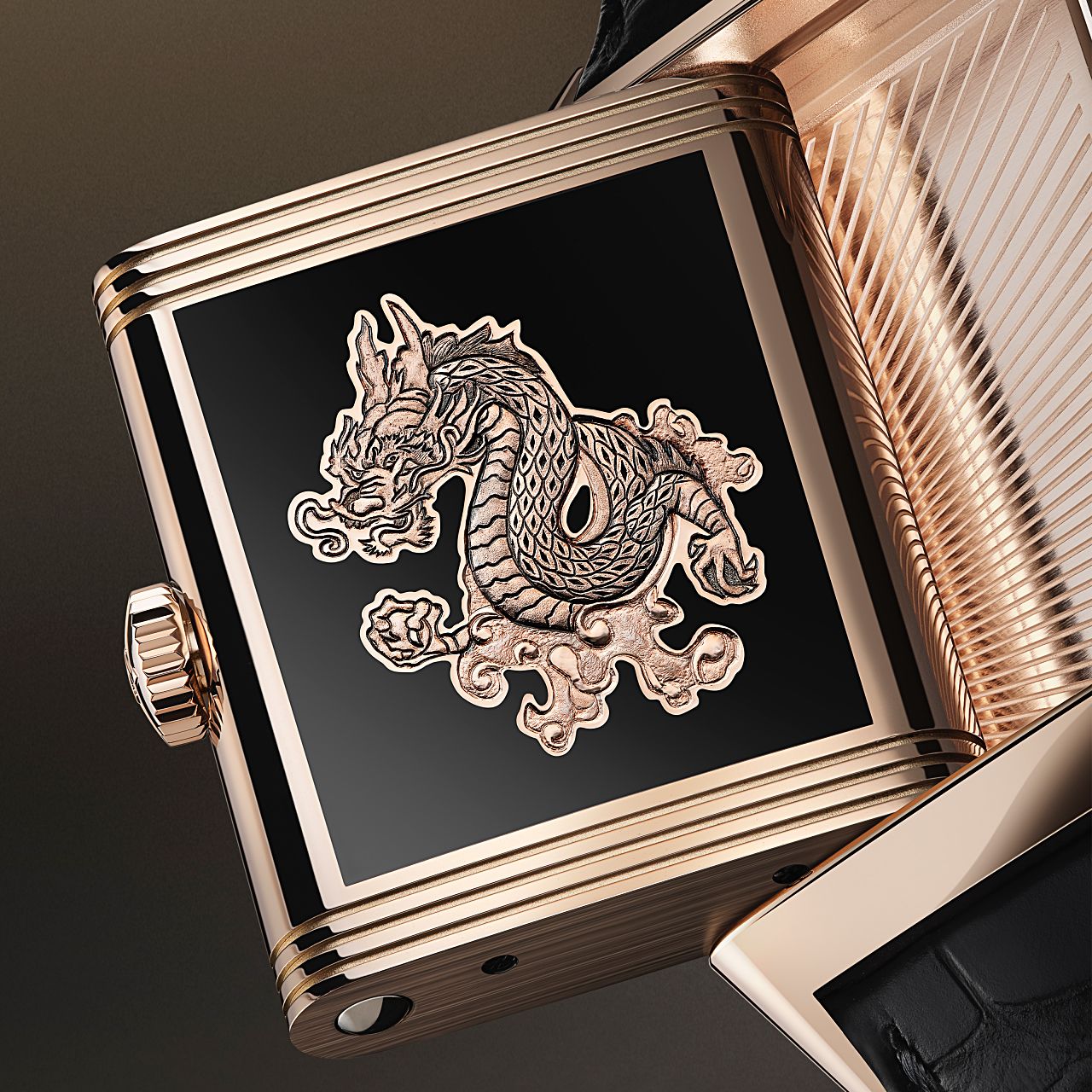 และเมื่อพลิกกลับมาที่ฝาหลังด้านหลัง จะพบกับรูปมังกรแบบจีนที่รายล้อมไปด้วยก้อนเมฆที่เกิดจากการแกะสลักด้วยมือจากช่างฝีมือระดับปรมาจารย์ของ JLC ราวกับภาพสามมิติที่เหมือนกับมังกรนั้นลอยออกจากตัวเรือน แม้กระทั่งรายละเอียดเล็ก ๆ อย่างเกล็ดที่กระจายอยู่ทั่วตัวมังกร โดยผ่านการเคลือบ Enamel สีดำสนิทด้วยเทคนิค Grande Feu บนพื้นหลังสลับกับการขัดแต่งผิวแบบขัดมันและพ่นทราย