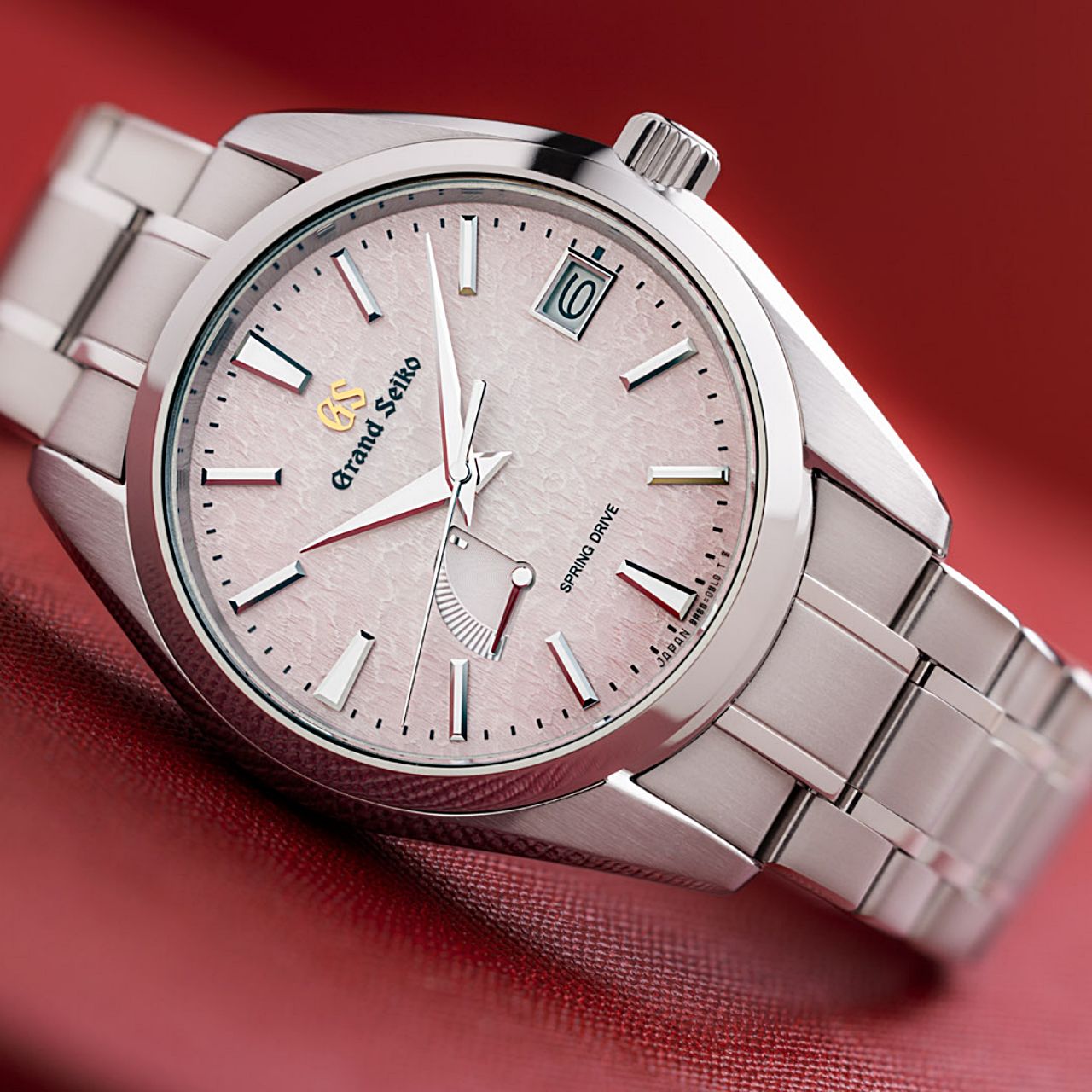 เริ่มต้นด้วยนาฬิกา Spring Drive SBGA497 ที่มาพร้อมกับหน้าปัด “Snowflake” อันเลื่องชื่อที่มาในโทนสีชมพู ที่ได้แรงบันดาลใจมาจากฤดูหนาวในเมืองชินชูซึ่งเป็นบ้านเกิดของกลไก Spring Drive ซึ่งจะมีแสงอาทิตย์ยามเช้าที่สาดลงไปบนผิวของหิมะที่ปกคลุมบนยอดเขาโฮทากะ โดยมีการใช้สีแดงกับเข็มบอกพลังงานสำรองตรงตำแหน่ง 7 นาฬิกา และโลโก้ GS สีทอง ซึ่งเป็นโทนสีที่สะท้อนถึงแสงแรกแห่งรุ่นอรุณ มีหน้าต่างบอกวันที่ตรงตำแหน่ง 3 นาฬิกา ใช้กระจกหน้าปัด Sapphire เคลือบตัดแสงสะท้อน