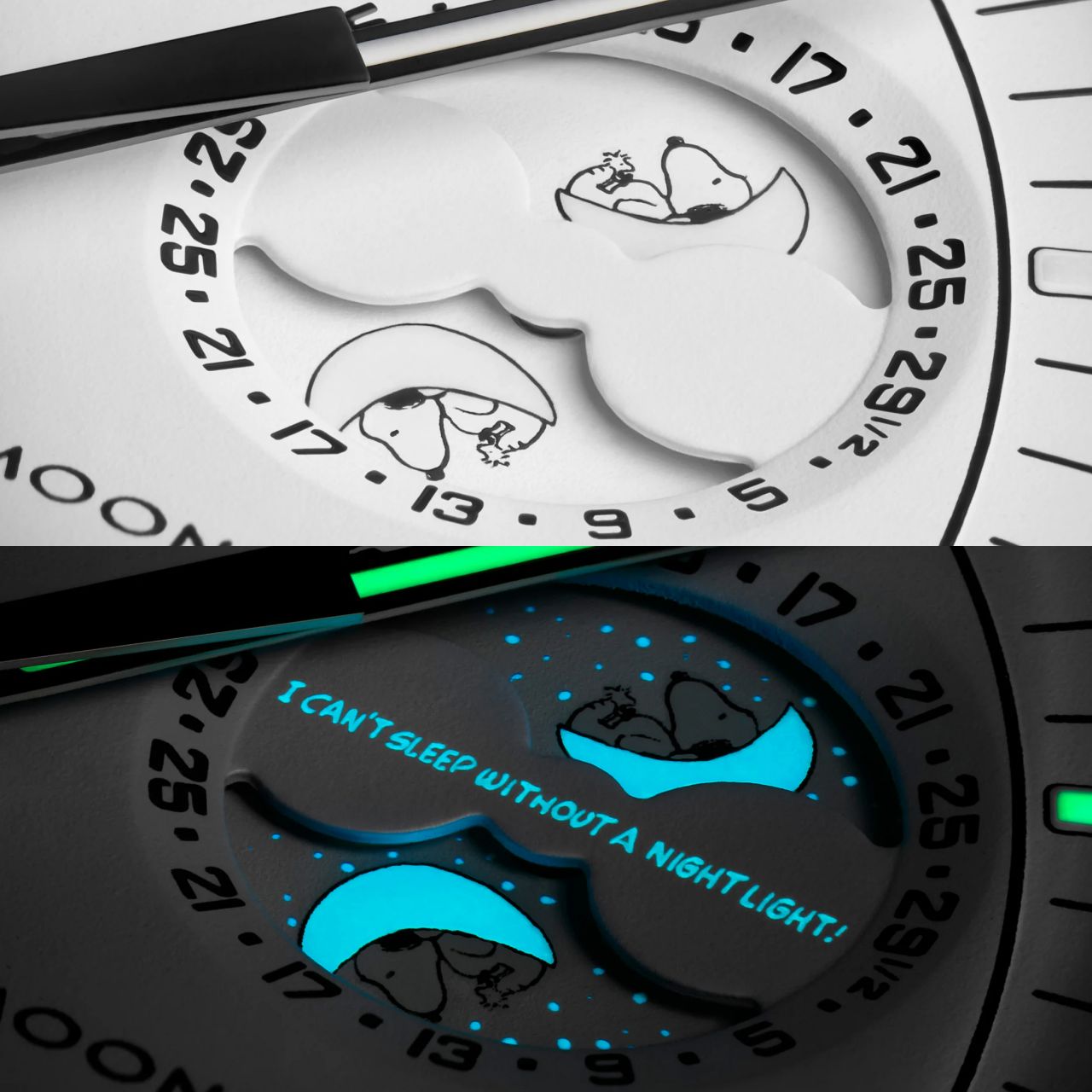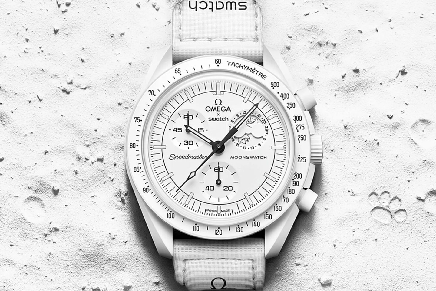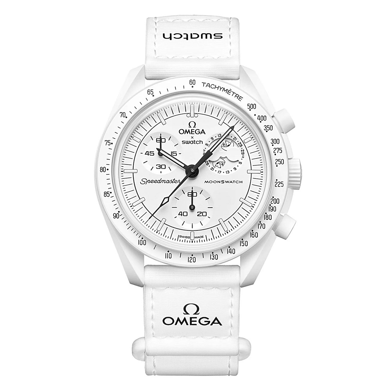 นาฬิการุ่นนี้มาในสีขาวล้วนเพื่อเป็นการระลึกถึง Full Moon หรือจันทร์เต็มดวง เข็มจับเวลา เข็มหน้าปัดย่อยและมาตรวัดความเร็วบนขอบหน้าปัดสีดำ หน้าปัดย่อยและพื้นหลังขอบหน้าปัดสีขาวของ นาฬิการุ่นนี้ โดดเด่นด้วยฟังก์ชันข้างขึ้นข้างแรมที่ละเอียดถึง 29 ½ วัน โดยมีการใส่รูปเจ้า Snoopy ซึ่งเป็นมาสค็อตของ NASA มาตั้งแต่ยุค 1960s กำลังนอนหลับปุ๋ยบนดวงจันทร์บนจานหมุนข้างขึ้น-ข้างแรมตรงตำแหน่ง 2 นาฬิกา และเมื่อแสงยูวีส่องผ่านก็จะเห็นคำคมจากการ์ตูนเรื่อง Snoopy และดวงดาวที่ซ่อนอยู่บนพื้นหลัง โดยบนหน้าปัดมีการพิมพ์ข้อความของแบรนด์ OMEGA X Swatch โลโก้ Speedmaster อันเป็นเอกลักษณ์ และโลโก้ MoonSwatch หลักชั่วโมง เข็มชั่วโมง เข็มนาที และปลายเข็มจับเวลาเคลือบสาร Super-LumiNova®