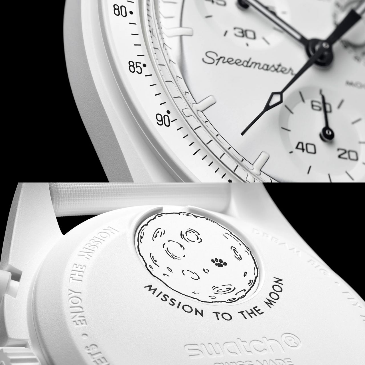ตัวเรือน Bioceramic ขนาด 42 หนา 13.75 มิลลิเมตร มาพร้อมกับกระจกหน้าปัด Plaxi สลักด้วยตัว “S” ตรงกลางซึ่งย่อมาจากโลโก้ของ Swatch ขอบ Bezel วัสดุ Bicoceramic สีขาวสลัก Tachymeter Scale สีดำพร้อมรายละเอียด “Dot Over 90” ที่ยกมาจากนาฬิกา Speedmaster รุ่นตำนานและมีการพิมพ์รูปดวงจันทร์ที่มีรอยเท้าของเจ้า Snoopy ไว้บนฝาหลัง Bioceramic แบบปิดทึบอีกด้วย โดยภายในขับเคลื่อนด้วยกลไก Swiss Quartz Chronograph ที่สามารถจับเวลาได้ต่อเนื่อง 12 ชั่วโมง พร้อมฟังก์ชันบอกข้างขึ้นข้างแรม และนาฬิกามาพร้อมกับสาย Velcro สีขาว