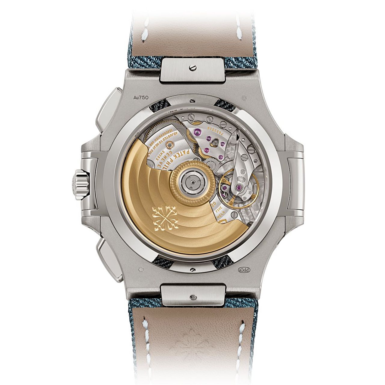 ตัวเรือน White Gold 18K ขนาด 40.5 มิลลิเมตร หนา 12.2 มิลลิเมตร กันน้ำลึก 30 เมตร ฝาหลังแบบโปร่งใสด้วยกระจก Sapphire โชว์การทำงานของกลไก Automatic In-House Cal.CH 28‑520 C/522 ความถี่ 28,800 ครั้ง/ชั่วโมง สำรองพลังงานสูงสุด 55 ชั่วโมง พร้อมกับฟังก์ชัน Flyback Chronograph ที่สามารถเริ่มต้นจับเวลาใหม่โดยไม่ต้องกดปุ่ม Stop และ Reset ก่อน โดย Patek Philippe ได้เลือกจับคู่กับสายผ้าสีนำ้เงินอมเทาเย็บติดสายหนังวัวที่ทำให้บุคลิกของนาฬิกาเรือนนี้ดู Casual มากขึ้นและมาพร้อมกับกับ Folding Buckle White Gold 18k อีกด้วย